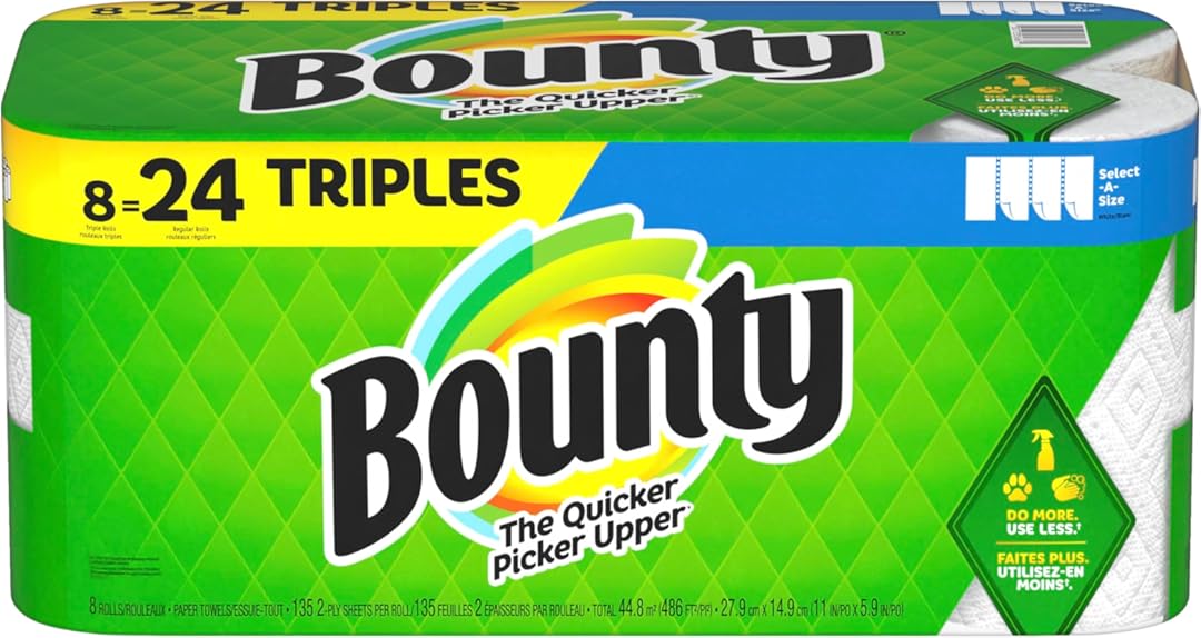 {"about_product": ["Pack contains 8 Triple Rolls of white Bounty Select-A-Size Paper Towels", "More absorbent so you can use less* *vs. leading ordinary brand", "Picks up messes quicker* *vs. leading ordinary brand", "With Select-A-Size rolls you can choose your sheet size based on the size of your mess.", "8 Triple Rolls = 24 Regular Rolls"], "product_description": "Spilled your drink? Quick! The Quicker Picker Upper. Be ready to tackle messes and spills with Bounty Paper Towels! Each sheet is 2x more absorbent, so you can use less and pick up spills and messes quicker than the leading ordinary brand. That’s why Bounty is the Quicker Picker Upper! Bounty Paper Towels are available in two sheet sizes, Full Sheet and Select-A-Size, so you can choose which option works best for you. Bounty Select-A-Size towels are versatile, so you can choose your sheet size depending on your mess. And if you’re buying the bigger packs, you’ll always have Bounty on hand. Bounty has a variety of pack and roll sizes to fit your needs. Bounty products are proudly made with American jobs and we’re fully committed to creating solutions for a sustainable future. Across all our products, we consider the impact on people, forests, and the world. That’s why for every tree we use, at least two are regrown so you can conveniently and confidently clean messes in the kitchen and around the house knowing Bounty Paper Towels is helping to keep forests greener. Bounty always has your back in and out of the kitchen so whether it’s juice on the counter or ice cream on the table, we make sure spills won’t stand a chance.n*vs. leading ordinary brand.", "product_information": {"ASIN": "B0CHHCTZC5", "Manufacturer": "Bounty", "Customer Reviews": "4.8 4.8 out of 5 stars \n\n (74)", "Best Sellers Rank": "#46,485 in Health & Household (See Top 100 in Health & Household) #122 in Paper Towels", "Item model number": "30772056615", "Product Dimensions": "24.53 x 12.24 x 10.98 inches; 5.85 Pounds", "Date First Available": "September 6, 2023"}, "product_details": {"Brand": "Bounty", "Ply Rating": "8-Ply", "Unit Count": "8.0 Count", "Sheet Count": "1080", "Special Feature": "High Absorbent"}}