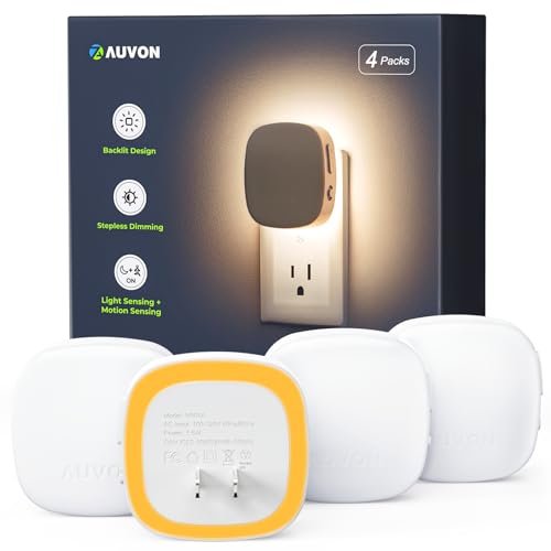 {"about_product": ["Diffuse Backlit Design: AUVON backlit night light features 16 LED bulbs with uniform luminescence and produces diffuse backlight by reflecting light onto the wall to avoid uncomfortable feeling of direct light into your eyes. Perfect for people who are sensitive to light and prone to insomnia;", "AUTO Mode: In this mode, the motion sensor will detect motion over a range of 3-5 meters and 120°. If a motion is detected in darkness or when the ambient light is insufficient, this motion activated night light will auto-on and then auto-off when no motion is detected for 60 seconds to save you energy;", "NIGHT Mode: In this mode, the dusk-to-dawn sensor will be activated, read the room light and perform corresponding actions. The light sensor night light will auto turn on at night or in the dark, auto turn off at dawn or in bright conditions, allowing for intelligent lighting without additional operation;", "Comfortable & Adjustable Lighting: This led night light can be short-pressed for 5-step dimming, and long-pressed for stepless dimming within 1-50 lm to meet your different brightness needs. If the power remains connected, the dimmable night light will retain the last brightness setting, so there is no need to readjust the brightness each time;", "Safe and Reliable: The plug into wall night lights use superior V-0 fire-resistant casing and adopt an over-current protection design to guarantee safety, while the compact design leaves the 2nd. outlet free for other devices. You will get 4* AUVON Backlit Night Lights, 1* User Manual and Technical Support;"], "product_description": null, "product_information": {"ASIN": "B0CLRPTGGY", "Brand": "AUVON", "Color": "A Warm White", "Shape": "Bulb", "Style": "Modern", "Voltage": "120 Volts (AC)", "Wattage": "1.5 watts", "Material": "Plastic", "Bulb Base": "E5", "Lamp Type": "Night Light", "Room Type": "Nursery, Bathroom, Bedroom, Hallway, Stairs, Livingroom", "Brightness": "50 Lumen", "Efficiency": "Energy Efficient", "Model Name": "AUVON Plug-in LED Backlit Night Light", "Finish Type": "Lacquered", "Item Weight": "9 ounces", "Light Color": "Warm White", "Part Number": "N001A4022", "Shade Color": "White", "Switch Type": "Touch", "Finish types": "Lacquered", "Is Cordless?": "No", "Manufacturer": "AUVON", "Power Source": "Corded Electric", "Shade Height": "1.58 Inches", "Base Material": "Plastic", "Bulb Features": "Dimmable; Backlit", "Is Waterproof": "False", "Mounting Type": "Wall Mount", "Control Method": "Touch", "Shade Material": "Polycarbonate", "Lighting Method": "Adjustable", "Number of Items": "4", "Special Feature": "Backlit; Motion Sensor; Light sensor; Dimmable; Energy Efficient; Lightweight; Motion Sensor; Portable; Style Name", "Number of Pieces": "4", "Product Benefits": "provides gentle, adjustable lighting with automatic sensors for energy efficiency and safety", "Special Features": "Backlit; Motion Sensor; Light sensor; Dimmable; Energy Efficient; Lightweight; Motion Sensor; Portable; Style Name", "Best Sellers Rank": "#243 in Tools & Home Improvement (See Top 100 in Tools & Home Improvement) #10 in Night-Lights", "Color Temperature": "2700 Kelvin", "Installation Type": "Wall mount.", "Item model number": "N001A4022", "Light Source Type": "LED", "Sensor Technology": "motion sensor, dusk-to-dawn sensor", "Product Dimensions": "2.61\"D x 2.61\"W x 1.58\"H", "Batteries Included?": "No", "Batteries Required?": "No", "Included Components": "4* AUVON Night Lights, 1* User Manual", "Date First Available": "December 1, 2023", "Indoor/Outdoor Usage": "Indoor", "Light Output Maximum": "50 Lumens", "Water Resistance Level": "Not Water Resistant", "Number of Light Sources": "16"}, "product_details": {"Bulb Base": "E5", "Finish Type": "Lacquered", "Item Weight": "9 Ounces", "Base Material": "Plastic", "Product Dimensions": "2.61"D x 2.61"W x 1.58"H"}}