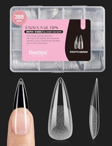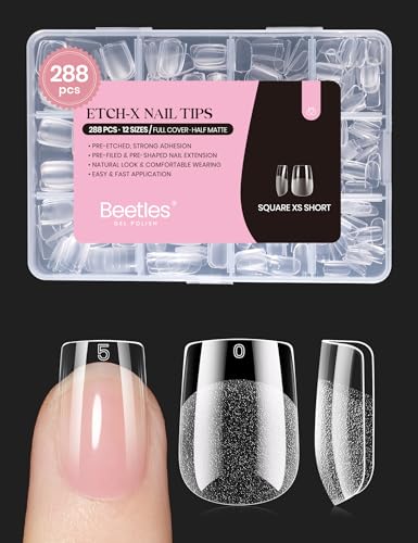 {"about_product": ["【No Shaping Needed】: Beetles short square nail tips choose inner half matte texture, with stronger friction, better fitting your natural nails. You can stick the full cover nail tips with the nail directly, and enjoy the privilege of \"NO NEED TO FILE\". Also, the nails are pre-shaped, saving time and effort. No worries, your nails will become thinner due to polishing, providing better care for your nails.", "【Fit Nails Perfectly】:This 288 PCS fall false nail tips set comes in 12 sizes for effortless matching to each finger. Each nail tip in the transparent series features a thinner edge to fit your natural nails. The pre-filed design reduces the need for extensive filing. Beetle nail tips offer a more natural appearance, resembling nails that have grown out naturally.", "【Premium Quality Nail Tips】:Crafted from the short square, beetles fake nails offer an innovative natural wear feeling. The thickness of each nail tip is 2-4 times more than natural nails, providing sturdy and durable extended nails. Even if bent, it retains its original form without leaving marks, ensuring seamless nail application and design.", "【Easily Use】Extend your nails in 3 minutes and show them off for more than 28 days! Beetle gel nail tips can be used for gel nail polish, liner gel art, dip powder nails, and poly nail extension gel, great for nail salons, and DIY at-home nail art. (Tips: Nail glue is not included, which needs to be ordered separately.)", "【Environmental & Healthy】: Beetles fall gel nail tips are made from environmental materials, making them safe and odorless. With good tenacity and highly pigmented, Beetle's premium gel nail tips bring you a brilliant shiny finish, smooth appearance, and flawless coverage."], "product_description": null, "product_information": {"ASIN": "B0D1C9SZ3X", "Customer Reviews": "4.5 4.5 out of 5 stars \n\n (22,024)", "Best Sellers Rank": "#164 in Beauty & Personal Care (See Top 100 in Beauty & Personal Care) #3 in False Nail Tips", "Package Dimensions": "6.26 x 4.41 x 0.67 inches; 3.21 ounces"}, "product_details": {"Size": "12 Sizes", "Brand": "beetles Gel Polish", "Color": "Short Square 12 Sizes 288 PCS", "Style": "Short Square Gel Nail Tips", "Material": "Plastic"}}