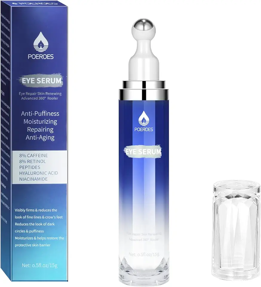 Eye Serum with 8% Caffeine 8% Retinol Hyaluronic Acid Niacinamide peptides for Puffy Bags Fine Lines Dark Circles Wrinkles, Under Eye Cream with 360° Roller Massage Ball, 0.5 fl. oz