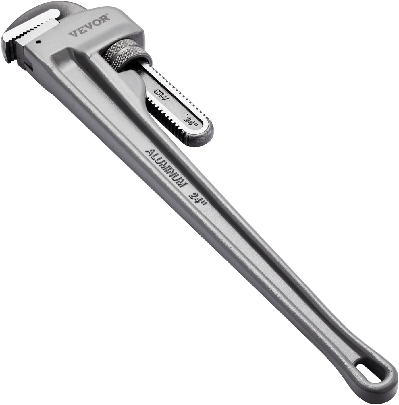 {"about_product": ["Lightweight Wrench: Aluminum pipe wrench is 40% lighter than similar steel tools, making it easier to carry and less fatiguing during prolonged use, whether in workshop operations or outdoor maintenance.", "Durable Construction: The pipe wrench head is forged from CRV alloy with a hardness of 52HRC, and heat-treated jaws enhance wear resistance and deformation resistance, extending its lifespan.", "Easy Adjustment: The Non-slip knurled nut of the straight pipe wrench ensures smooth adjustments without slipping during single-handed operation. You can rotate the nut to adjust jaw size for various part dimensions. Self-cleaning thread design reduces contamination and wear, extending usability.", "Ergonomic Design: H-shaped handle design of the aluminum straight pipe wrench provides excellent weight distribution for easier handling and increased torque, allowing you to work more efficiently without excessive fatigue.", "Wide Application: The 24\" plumbing wrench grips pipes up to 4.1\" / 105mm in diameter, suitable for tasks requiring fastening, loosening, or adjusting threaded connections in mechanical manufacturing, automotive repair, construction, and plumbing."], "product_description": null, "product_information": {"UPC": "197988216100", "ASIN": "B0D82KXN89", "Size": "24\" Straight Pipe Wrench", "Brand": "VEVOR", "Shape": "H-shape", "Finish": "\\", "Material": "Aluminum", "End Style": "Adjustable", "Head Style": "Adjustable", "Finish Type": "\\", "Item Length": "24 Inches", "Item Torque": "2825 Newton Meters", "Item Weight": "5.34 pounds", "Part Number": "24 inch Pipe Wrench", "Manufacturer": "VEVOR", "Is Non Sparking": "No", "Best Sellers Rank": "#79,097 in Tools & Home Improvement (See Top 100 in Tools & Home Improvement) #50 in Pipe Wrenches", "Item model number": "TD0505 24\"", "Batteries Required?": "No", "Included Components": "pipe wrench", "Wrench Length Style": "Standard", "Date First Available": "July 1, 2024", "Measurement Standard": "SAE (Inch)", "Item Package Quantity": "1"}, "product_details": {"Brand": "VEVOR", "Material": "Aluminum", "Item Length": "24 Inches", "Item Weight": "5.3 Pounds", "Item Package Quantity": "1"}}