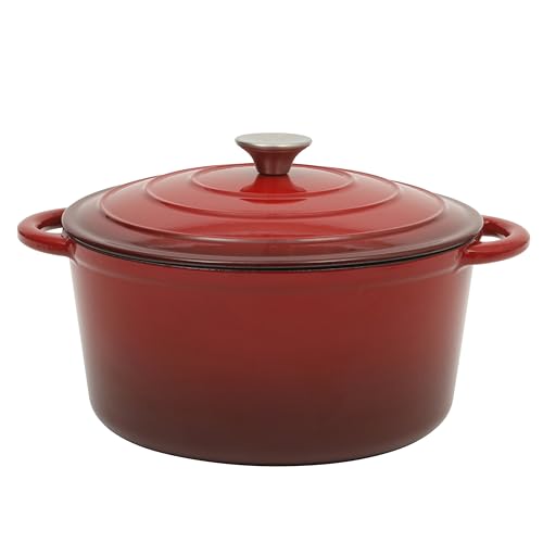 {"about_product": ["A BOX INCLUDES: One 5-quart enameled cast iron Dutch oven with lid", "BEST IN VERSATILITY: Cast iron Dutch oven is an exceptional piece of cookware to braise and bake, fry and sauté, simmer and serve. Heavy-duty construction promotes superior heat distribution and retention.", "PORCELAIN ENAMEL FINISH: Enameled surface never needs seasoning. Glossy finish is easy to clean and hard to miss with its beautiful, vibrant colorway.", "EASY-GRIP HANDLES: Sturdy side handles offers a strong grip when serving from the oven to the table.", "SELF-BASTING LID: Drip points underneath the lid allow continuous basting to improve flavor and texture"], "product_description": "A cast iron Dutch oven is a classic piece of cookware and a worthwhile investment for new and experienced home chefs. The Addlestone 5-quart Enameled Cast Iron Dutch Oven with Lid is safe to use on all stovetops and in the oven up to 500°F. As a mult-use pot, this Dutch oven can slow-cook, bake, deep-fry and sear perfectly. Durable cast iron construction distributes and retains heat nicely and evenly, leaving no spot uncooked. Beautifully coated with porcelain enamel finish, it is easy to clean and maintain as it requires no constant seasoning compared to a pre-seasoned cast iron cookware. It comes with a self-basting lid to lock in the heat and redirect the moisture back onto the food. And when all the work is done, serve a warm, homemade meal in this vibrant Dutch oven that deserves to be at the center of every spread. Hand wash only. \n\nMake every home a Gibson Home. A multi-category collection of kitchen and dining essentials, Gibson Home offers style and value for everyday living. Enjoy preparing, cooking, and serving delicious meals in a wide selection of dinnerware, cookware, bakeware, cutlery, glassware, and more. Designed with function, reliability, and versatility, Gibson Home provides dining and entertaining staples to make every mealtime or gathering a culinary success", "product_information": {"UPC": "085081650580", "ASIN": "B0DHT3DDQY", "Brand": "Gibson Home", "Color": "Gradient Red", "Shape": "Round", "Capacity": "5 Liters", "Material": "Cast Iron", "With Lid": "Yes", "Finish Type": "Enameled", "Item Weight": "13.07 pounds", "Is Oven Safe": "Yes", "Lid Material": "Enameled Cast Iron", "Manufacturer": "Gibson Overseas, Inc.", "Best Sellers Rank": "#10,696 in Kitchen & Dining (See Top 100 in Kitchen & Dining) #55 in Dutch Ovens", "Item model number": "143803.02", "Is Dishwasher Safe": "No", "Product Dimensions": "12.6\"W x 6.7\"H", "Temperature Rating": "500 Degrees Fahrenheit", "Date First Available": "September 23, 2024", "Product Care Instructions": "Hand Wash Only"}, "product_details": {"Brand": "Gibson Home", "Color": "Gradient Red", "Capacity": "5 Liters", "Material": "Cast Iron", "Finish Type": "Enameled"}}