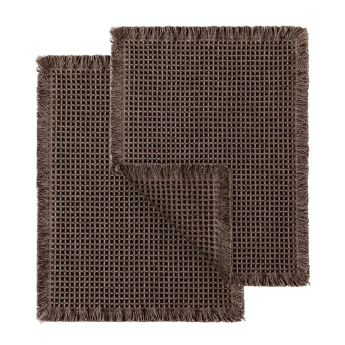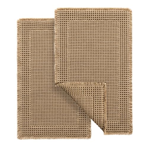 {"about_product": ["UPGRADED WAFFLE DESGIN: 18 x 30 Inch. Including 2 brown waffle bath mats. These boho bath mats are woven with upgraded yarns. The heavier and thicker threads are applied to ensure the pattern will be more solid and compact. It is not only decorative but also durable and NEVER OUT OF SHAPE. Note: Length and width of these bath rugs include tassel part.", "ULTRA WATER ABSORBENT:Double layer of deep waffle texture absorbs water instantly and more breathable. These super absorbent bath mats can soak up the water from your feet and keep your floor dry like a giant sponge, when you step out of the shower or bathtub, and protect your feet from the cold floor.", "NON SLIP RUBBER BACKING: These non slip bath mats are designed with clear rubber backing(HMA-Hot Melt Adhesive, invisible but touchable). They offer good traction and grip on smooth surfaces, Guaranteed the safety of you and your family.", "COMFORTABLE AND SOFT: 3D waffle design combined with flexible yarns make the bathroom floor mat softer and cozier. Bring you a comfortable underfoot feeling. Enjoy a comfort space after taking a shower. MIULEE waffle bath mats are not only provide functionality but also enhance the aesthetic appeal of your bathroom.", "EASY CARE: Hand wash or rinse them under running water for best results. Avoid machine-washing to keep your mat in perfect shape. And please air dry, do not use dryer. For simple daily cleaning, just shake off the dust with your hands to maintain the anti-slip properties."], "product_description": null, "product_information": {"ASIN": "B0DJLYW63R", "Size": "18''x30''", "Brand": "MIULEE", "Color": "Brown", "Style": "Boho", "Pattern": "Waffle", "Material": "Polyester", "Model Name": "MIULEE", "Weave Type": "Flat Woven", "Item Weight": "1.83 pounds", "Pile Height": "Low Pile", "Manufacturer": "MIULEE", "Rug Form Type": "Bath Mat", "Material Feature": "Soft, Comfortable, Absorbent, Durable", "Number of Pieces": "2", "Best Sellers Rank": "#2,781 in Home & Kitchen (See Top 100 in Home & Kitchen) #17 in Bath Rugs", "Construction Type": "Machine Made", "Item model number": "MIULEE", "Back Material Type": "Rubber", "Is Stain Resistant": "Yes", "Product Dimensions": "30\"L x 18\"W", "Date First Available": "November 9, 2024", "Indoor/Outdoor Usage": "Indoor", "Recommended Uses For Product": "Shoes"}, "product_details": {"Size": "18''x30''", "Brand": "MIULEE", "Material": "Polyester", "Weave Type": "Flat Woven", "Item Weight": "1.8 Pounds"}}