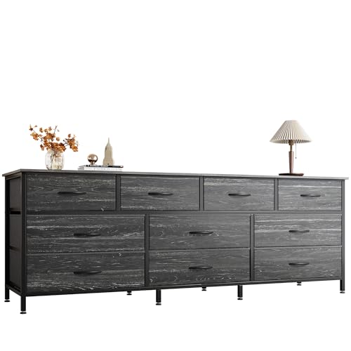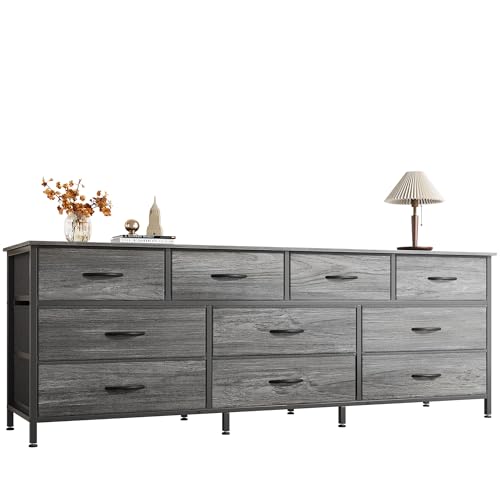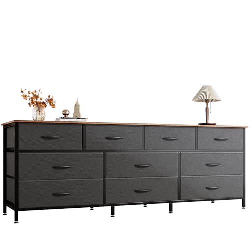{"about_product": ["【10 Drawers Dresser】Tired of Messy Clothes Piles? This fabric bedroom dresser is a storage solution. It's roomy enough to neatly stash all your clothing items like jeans, shirts, and sweaters. The 4 small drawers on top and 6 medium ones help you organize everything so you can easily find what you need, saving you the hassle of rummaging through a messy pile", "【TV Stand for 70 Inch TV】The solid wooden top of this large wide dresser can be used as TV stand for 55, 65, 70 inch TV in Living Room. Measuring 63 inches in length, this storage dresser provides a stable platform. You can enjoy your favorite shows while also having additional storage for remotes, DVDs, and other media accessories", "【Versatile Fabric Drawer Dresser】They are lightweight fabric drawers on a metal frame with a wood top. It’s very light so easy to move around to different rooms as well. This drawers for clothing comes in various colors such as black, white with a sleek PU leather surface, trendy grey, a cool charcoal black wood grain print, and a charming rustic brown. You can pick the one that perfectly complements your bedroom, living room, or dorm room, making it a seamless addition to your space", "【Sturdy, Safe and Stable】Made from a strong metal frame and a sturdy wooden top, this dresser tv stand with storage is built to last. The easy-to-pull handles are convenient for everyone. The drawers slide smoothly, even for little hands. With included anti-tip kits, it stays put and keeps your children safe. The 8 adjustable feet not only keep it stable on any surface but also protect your floors from scratches", "【Easy Assembly】13.8\"D x 63\"W x 26.8\"H. With this bedroom tv stand, you don't have to spend hours putting together. It comes with all the parts and clear instructions. You can have it assembled and ready to use in just 30 minutes. It's a stress-free process that lets you start enjoying your new storage and TV stand right away"], "product_description": null, "product_information": {"ASIN": "B0DLNXMWSV", "Brand": "Huuger", "Color": "Grey", "Room Type": "Bedroom, Living Room", "Item Weight": "43.8 pounds", "Manufacturer": "Huuger", "Target Audience": "Adult", "Assembly Required": "Yes", "Best Sellers Rank": "#74,734 in Home & Kitchen (See Top 100 in Home & Kitchen) #107 in Dressers & Chests of Drawers", "Product Dimensions": "13.8\"D x 63\"W x 26.8\"H", "Date First Available": "December 6, 2024", "Product Care Instructions": "Wipe with Damp Cloth"}, "product_details": {"Brand": "Huuger", "Material": "Fabric", "Finish Type": "Polished", "Number of Drawers": "10", "Product Dimensions": "13.8"D x 63"W x 26.8"H"}}