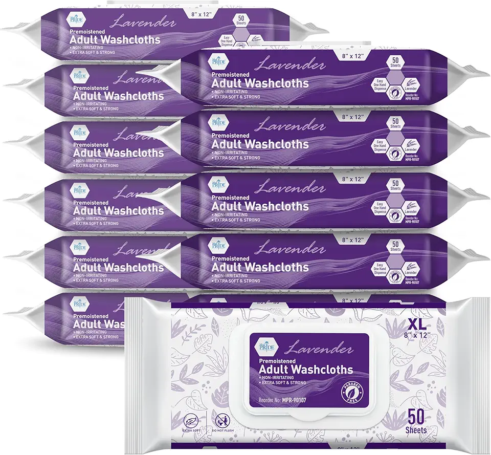 MED PRIDE Premoistened Disposable Washcloths for Adults 8 X 12 in | Ultra-Soft, Paraben-Free, Rinse Free | Lavender Scent | Pack of 600