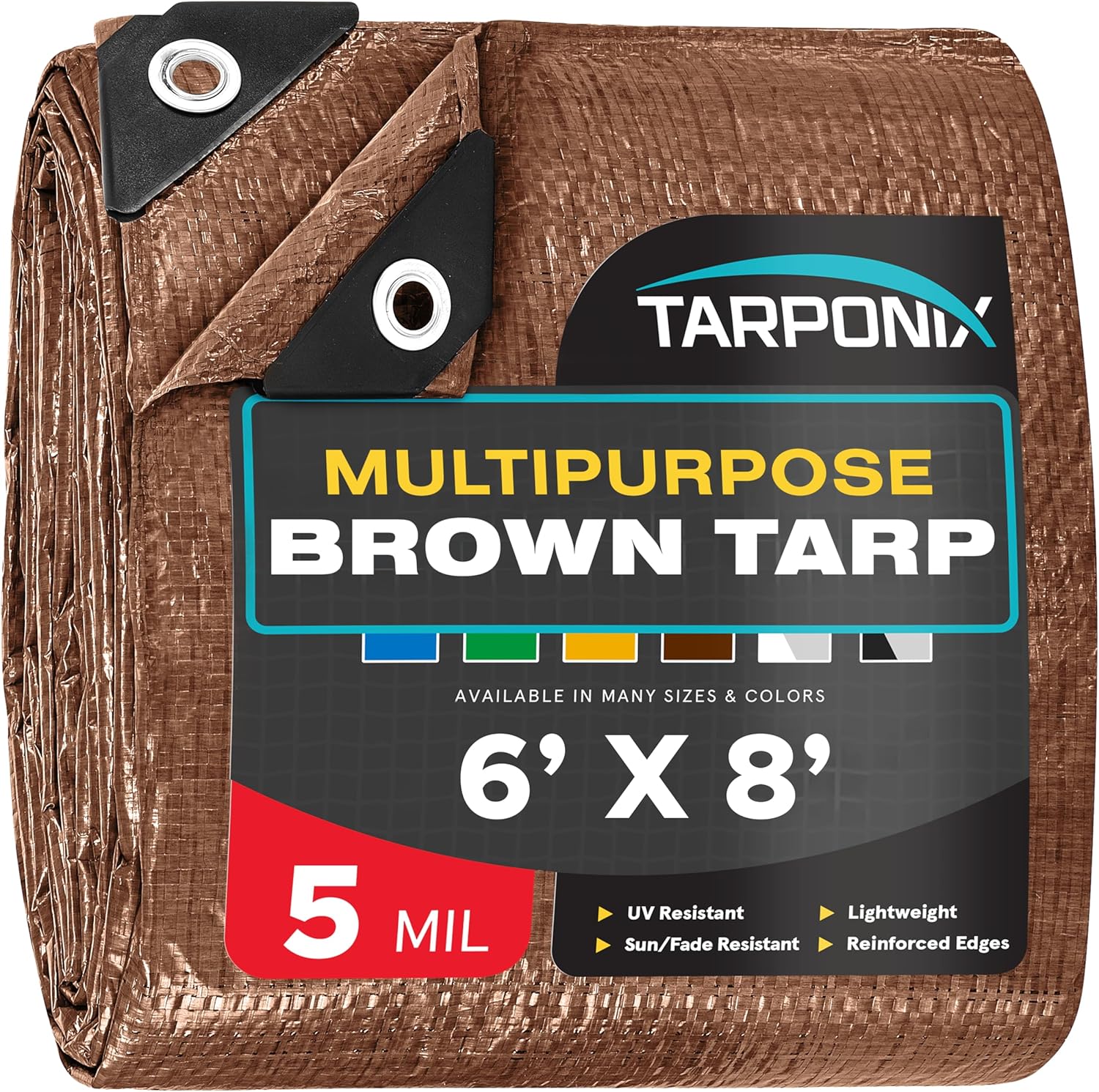 {"about_product": ["Reliable Weatherproof Protection – Crafted with 5 Mil thick polyethylene, this tarp is waterproof, UV-resistant, and built to withstand sun, rain, wind, or snow all year round.", "Durable & Tear-Resistant Design – Reinforced edges and strong plastic material make this tarp ideal for long-term use without tearing, rotting, or wearing down.", "Lightweight & Easy to Handle – Despite its strength, the tarp is lightweight and flexible, making it easy to fold, carry, and secure during any application.", "Rust-Proof Grommets for Secure Tie-Downs – Features metal grommets every 36 inches to make installation quick and ensure a snug, reliable fit wherever needed.", "Multi-Purpose Use Indoors & Outdoors – Great for construction, camping, roofing, yard work, equipment covers, emergency shelters, and more."], "product_description": null, "product_information": {"UPC": "810154645435", "ASIN": "B0DSCR82L4", "Size": "6 Feet x 8 Feet", "Brand": "TARPONIX", "Color": "Brown - 5 Mil", "Material": "Polyethylene (PE)", "Item Weight": "1.08 pounds", "Manufacturer": "TARPONIX", "Item Thickness": "5 Mils", "Number of Items": "1", "Best Sellers Rank": "#14,369 in Tools & Home Improvement (See Top 100 in Tools & Home Improvement) #63 in Tarps", "Item model number": "T5BR-68", "Product Dimensions": "72\"L x 96\"W", "Date First Available": "December 31, 2024", "Water Resistance Level": "Water Resistant", "Recommended Uses For Product": "Boat Cover, Camping, Emergency Preparedness, Gardening, Painting, Picnic"}, "product_details": {"Size": "6 Feet x 8 Feet", "Brand": "TARPONIX", "Color": "Brown - 5 Mil", "Material": "Polyethylene (PE)", "Item Weight": "0.49 Kilograms", "Item Thickness": "5 Mils", "Number of Items": "1", "Product Dimensions": "72"L x 96"W", "Water Resistance Level": "Water Resistant", "Recommended Uses For Product": "Boat Cover, Camping, Emergency Preparedness, Gardening, Painting, Picnic"}}