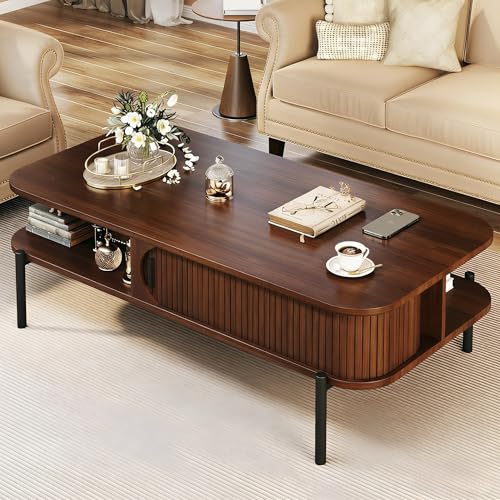 {"about_product": ["Ample Storage Space: Coffee table with a spacious top, measuring 39.4 inches, coffee tables for living room perfect for keeping your supplies organized and your daily essentials close at hand. The additional Open shelf provides ample storage space for magazines and toys, helping you maintain a neat and tidy living space", "Mid-Century Modern Design: The classic 39.4in mid century modern coffee table boasts a high-quality wood grain veneer finish that imitates the natural beauty and texture of walnut. The simple yet attractive design creates a classic look. Suitable for any living space, this wood coffee table adds a touch of vintage charm to your home", "Sturdy Walnut Coffee Table: Enjoy a long-lasting investment in your living space with our coffee table with storage. The waterproof and wear-resistant multi-step finish process protects the wood grain veneer while ensuring it remains looking sleek over time. The thick matte alloy legs provide stable support and add to its modern aesthetic", "Last & Easy Assembly: Our storage coffee table is made of sturdy MDF and high quality silent drawer slides. The living room coffee table comes with tools and numbered accessories, very easy to assemble following the step-by-step instructions", "Perfect Present & Quick Response: If you have any questions, please do not hesitate to get in touch with us for a satisfactory answer. Just click \"contact seller\" to get satisfied solutions."], "product_description": null, "product_information": {"ASIN": "B0FFT66P67", "Size": "39.4 inches", "Color": "Walnut", "Shape": "Round", "Base Type": "Leg", "Top Color": "Walnut", "Brand Name": "HUAHUU", "Model Name": "Coffee Table", "Item Height": "16.93 inches", "Item Weight": "37.7 Pounds", "Manufacturer": "HUAHUU", "Model Number": "Coffee Table 0002", "Table Design": "Coffee Table", "Material Type": "Engineered Wood, Metal", "Extended Length": "39.4 Inches", "Handle Material": "Metal", "Number of Items": "1", "Furniture Finish": "Walnut Wood Grain Veneer, Matte", "Best Sellers Rank": "#96,777 in Home & Kitchen (See Top 100 in Home & Kitchen) #46 in Coffee Tables", "Top Material Type": "MDF,Metal", "Is Stain Resistant": "No", "Frame Material Type": "MDF,Metal", "Included Components": "39.4\" Mid Century Modern Coffee Table", "Indoor Outdoor Usage": "Indoor", "Age Range Description": "Adult", "Is the item resizable?": "No", "Item Dimensions D x W x H": "39.4\"D x 19.69\"W x 16.93\"H", "Tools Recommended For Assembly": "Allen Key, Screw Driver"}, "product_details": {"Brand": "HUAHUU", "Color": "Walnut", "Item Weight": "37.7 Pounds", "Frame Material": "MDF,Metal", "Product Dimensions": "39.4"D x 19.69"W x 16.93"H"}}