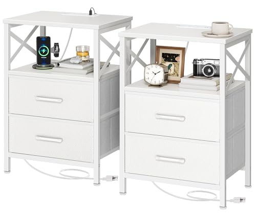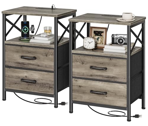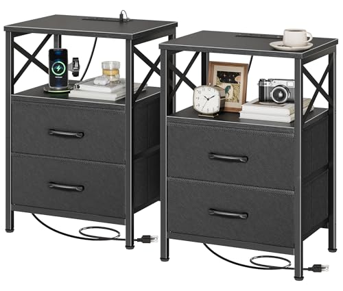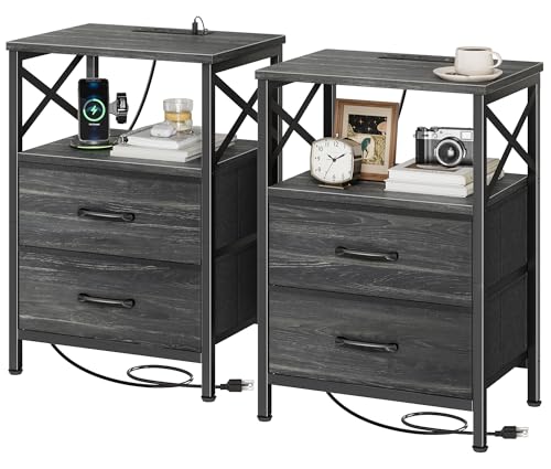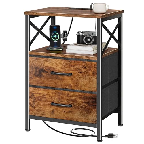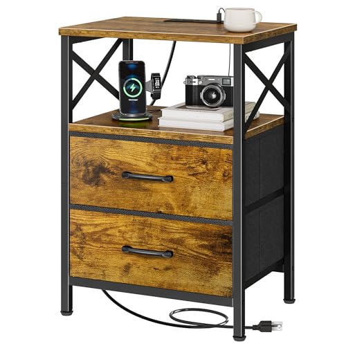 {"about_product": ["【Nightstand with Charging Station】This bedside table with charging station features 2 AC outlets, 1 USB port, and 1 Type-C port with a 4.9ft power cord, so you can easily charge your phone, tablet, or even smart glasses right beside your bed or sofa. No more hunting for wall sockets — everything’s within reach", "【Night Stand with 2 Drawers] A compact end table with surprisingly large storage! Thetabletop fits your lamp, books, or coffee cup easily, while 2 fabric drawers and an open shelf keep remotes, chargers, or bedtime reads neatly tucked away. Finally, a nightstand that actually holds everything you need", "【Durable Build with Stylish Details】Built to last with scratch-resistant, waterproof engineered wood and a sturdy powder-coated steel frame. The wood-grain finish adds warmth to your space, while the square metal handles and X-shaped side design give it that clean, modern charm. Beautiful and reliable — just how bedside table should be", "【Perfect for Small Spaces】Sized at 15.7\" × 11.8\" × 23.6\" , this little couch side table fits anywhere — beside your bed, next to your couch, or even as a printer stand in your home office. The adjustable feet keep it stable on uneven floors. A true multitasker: nightstand, end table, or mini sidekick — your choice", "【Quick Assembly & Multiple Color Choices】Available in 6 colors to match any décor. Comes with clear instructions, labeled parts, and tools for a hassle-free setup in minutes. You’ll be enjoying your new nightstand with drawers before your next cup of coffee is ready"], "product_description": null, "product_information": {"ASIN": "B0FNMK4W1W", "Size": "15.75 inches x 11.81 inches x 23.6 inches", "Color": "Rustic Brown", "Shape": "Rectangular", "Base Type": "Leg", "Leg Style": "Straight Leg", "Top Color": "Brown", "Base Color": "Brown", "Brand Name": "Huuger", "Style Name": "Modern", "Item Height": "23.6 inches", "Item Weight": "8.57 Kilograms", "Manufacturer": "Huuger", "Table Design": "Nightstand", "Material Type": "Engineered Wood, Metal", "Handle Material": "Metal", "Number of Items": "2", "Furniture Finish": "Matte", "Best Sellers Rank": "#28,544 in Home & Kitchen (See Top 100 in Home & Kitchen) #39 in Nightstands", "Number of Drawers": "2", "Top Material Type": "Engineered Wood", "Is Stain Resistant": "No", "Frame Material Type": "Metal", "Included Components": "Assembly Instructions, Tools, 2 Drawers, Open Shelf", "Indoor Outdoor Usage": "Indoor", "Is the item resizable?": "No", "Item Dimensions D x W x H": "11.81\"D x 15.75\"W x 23.6\"H"}, "product_details": {"Brand": "Huuger", "Color": "Rustic Brown", "Item Weight": "8.57 Kilograms", "Frame Material": "Metal", "Product Dimensions": "11.81"D x 15.75"W x 23.6"H"}}