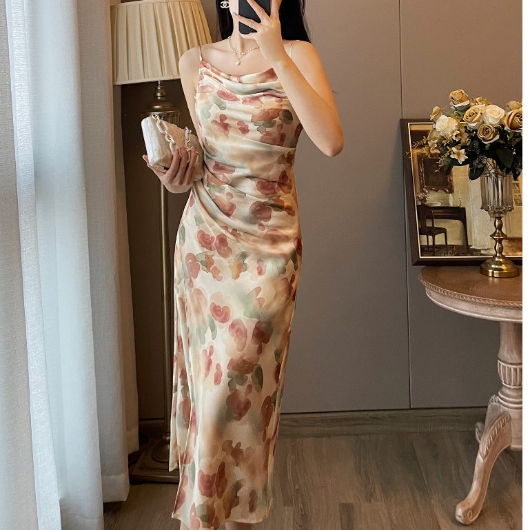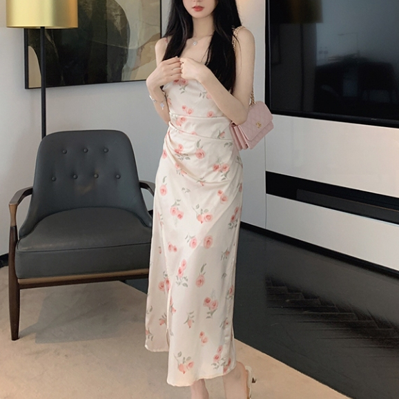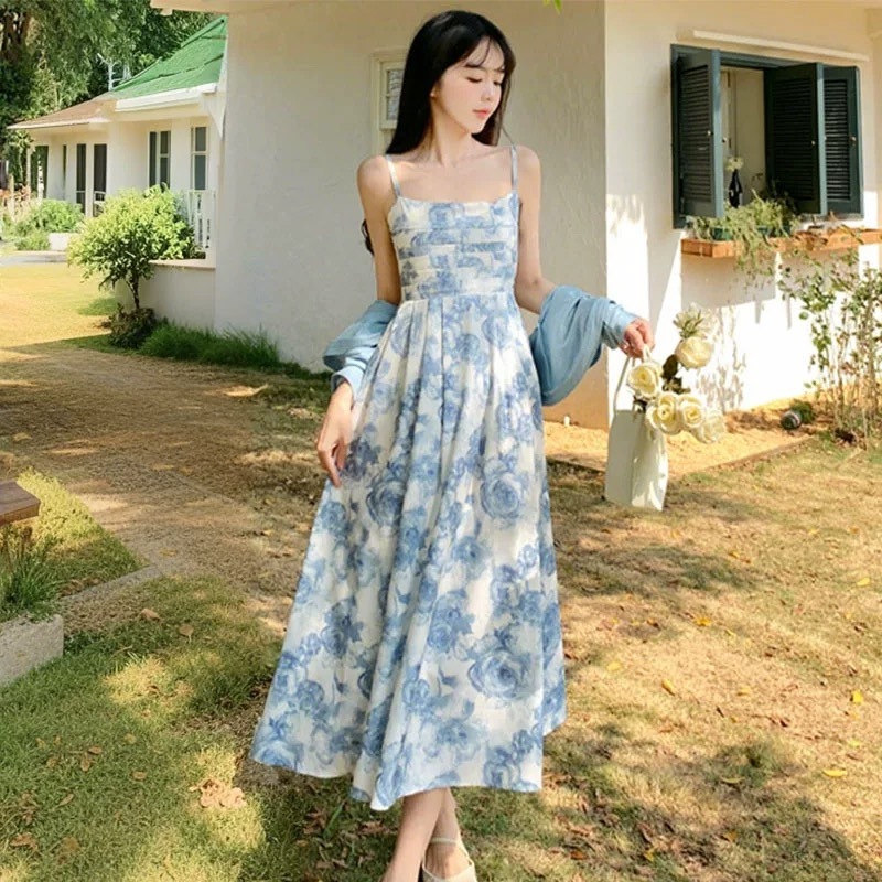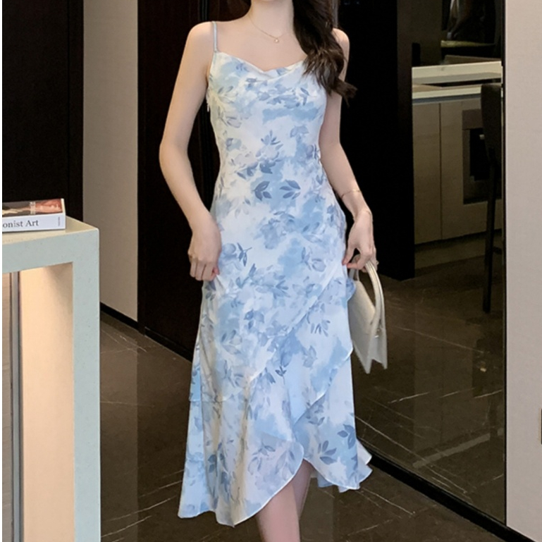 baby blue dress women korean style gown dress women plus size casual chiffon summer floral dress sleeveless halter