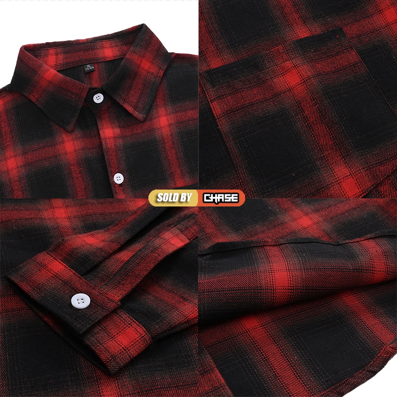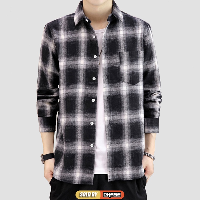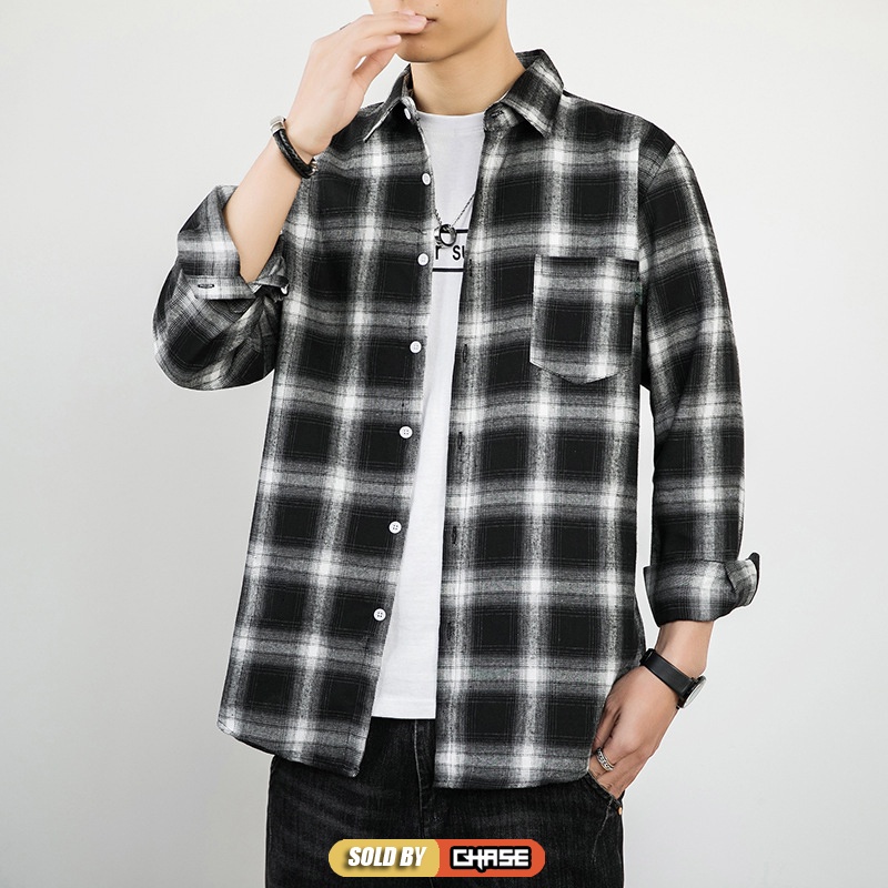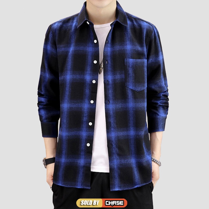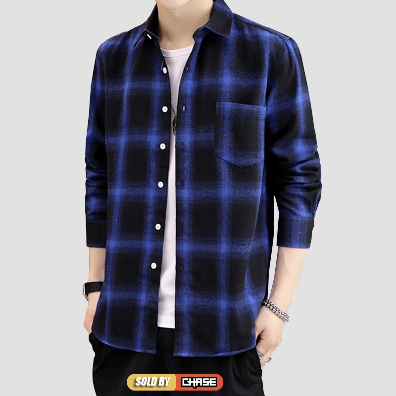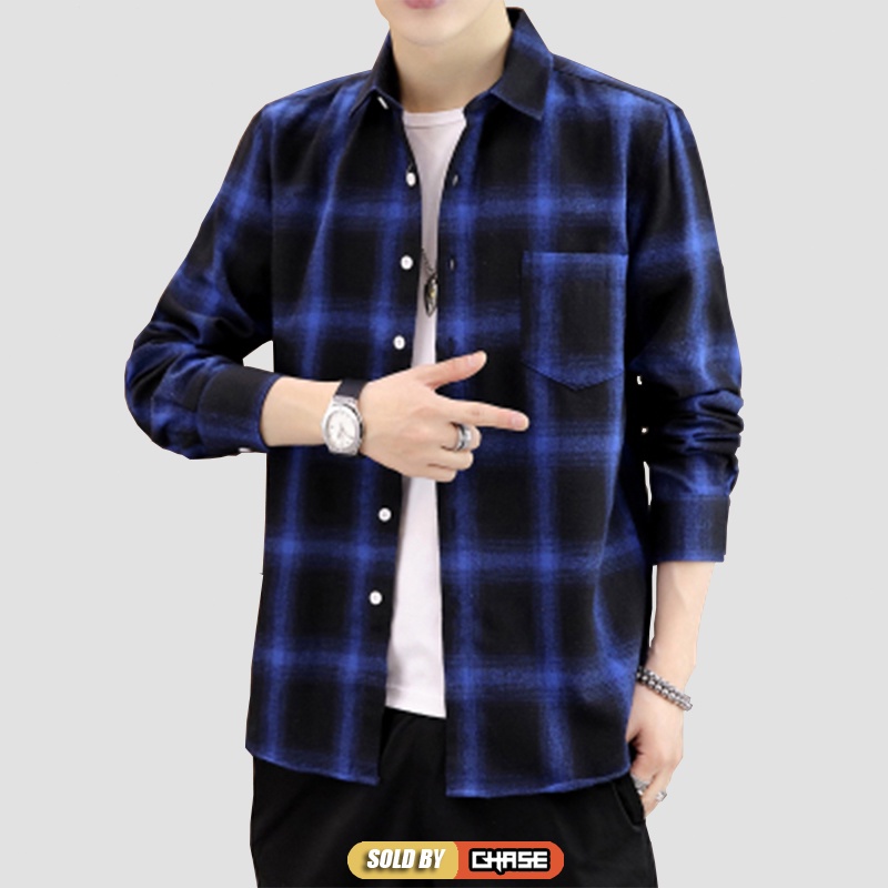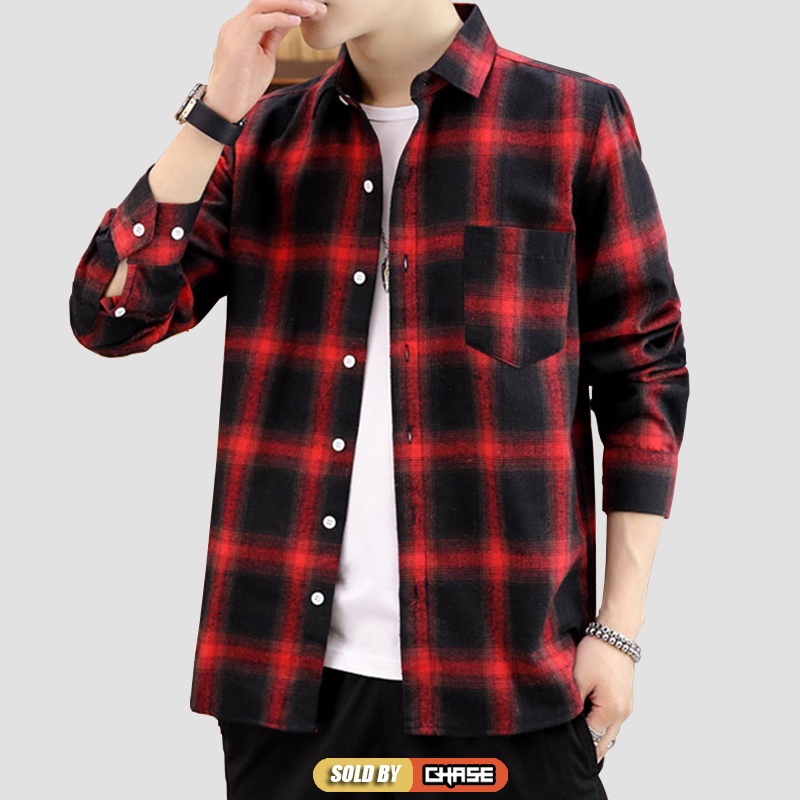 Baju Kemeja Lelaki Long Sleeve Checker Shirt Casual Fashion Kemeja Lelaki Trendy Koreal Top Black Navy Red Men Shirt