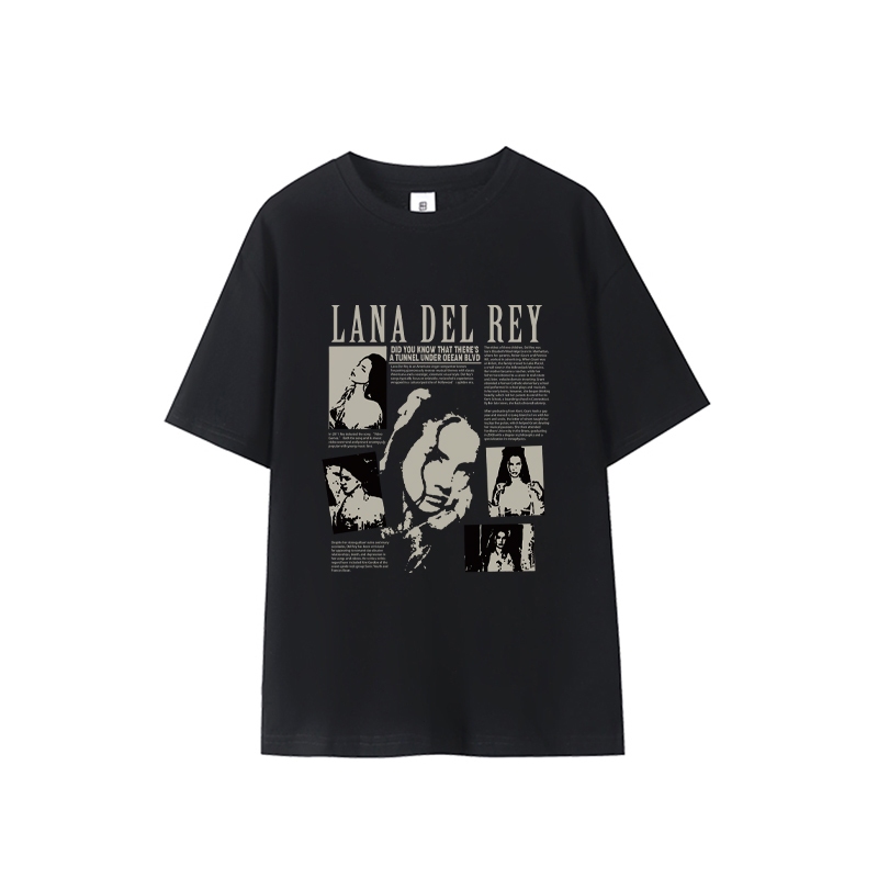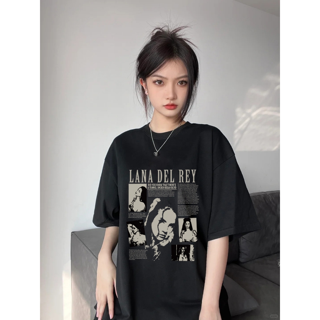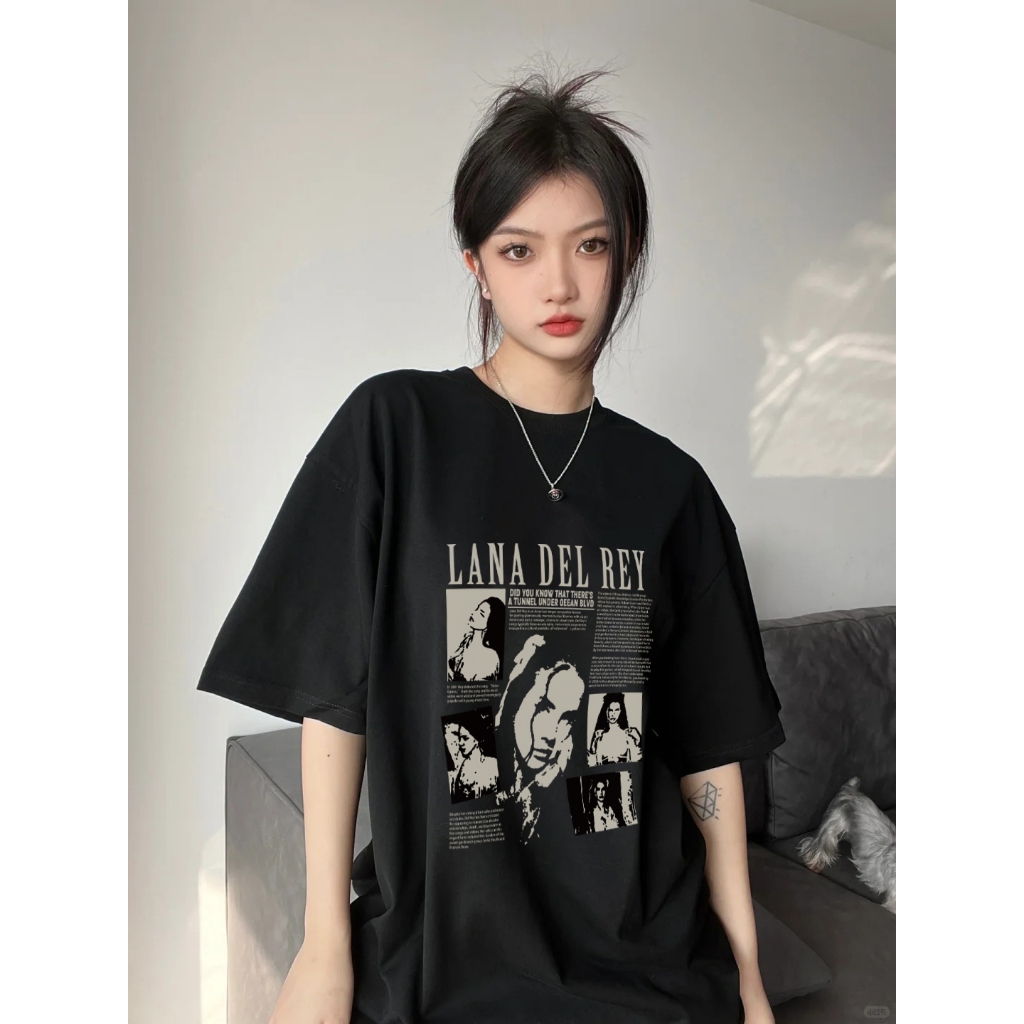 Black loose 100% cotton top with retro band print oversized women's short sleeved T-shirt top