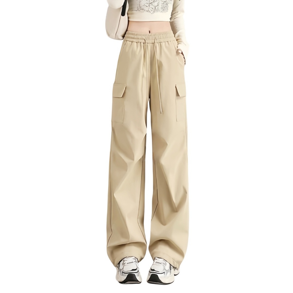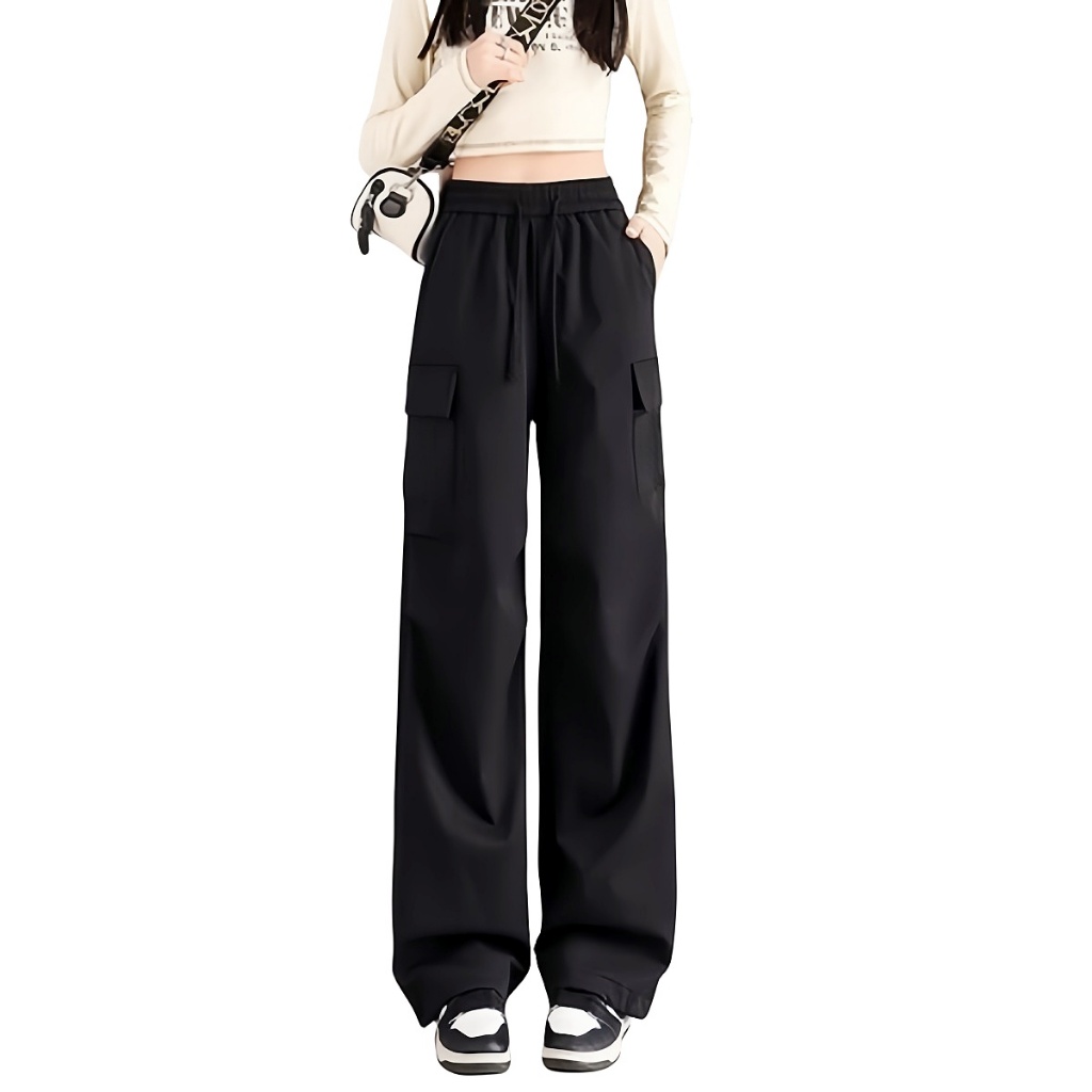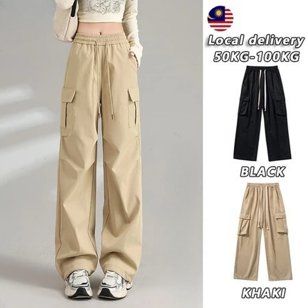 BlackVersatile style Seluar Cargo Perempuan Loose Women Cargo Pants Straight Cut Seluar Seluar Perempuan Casual Khaki 7J