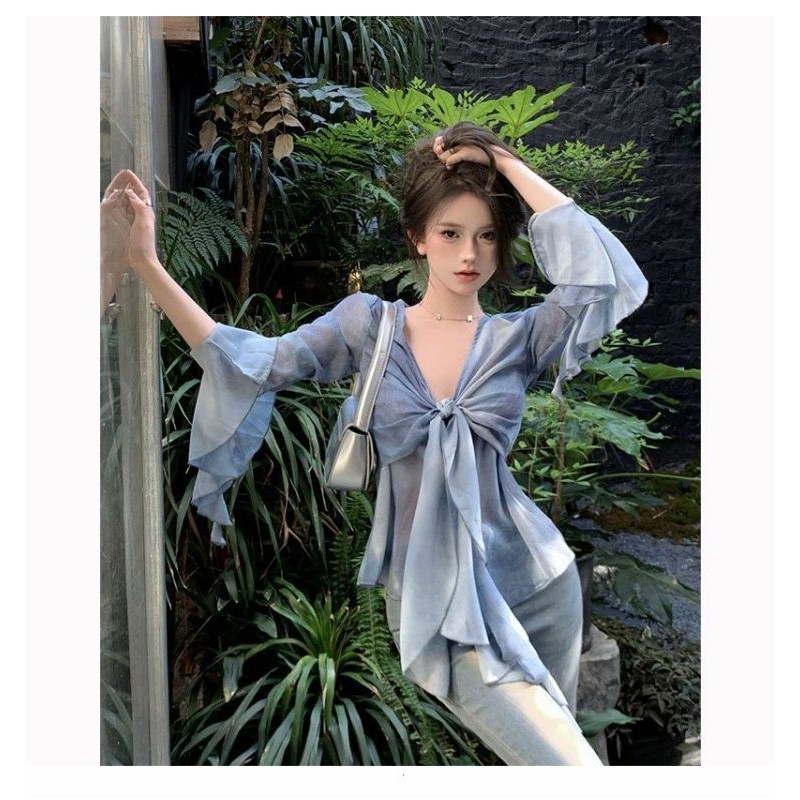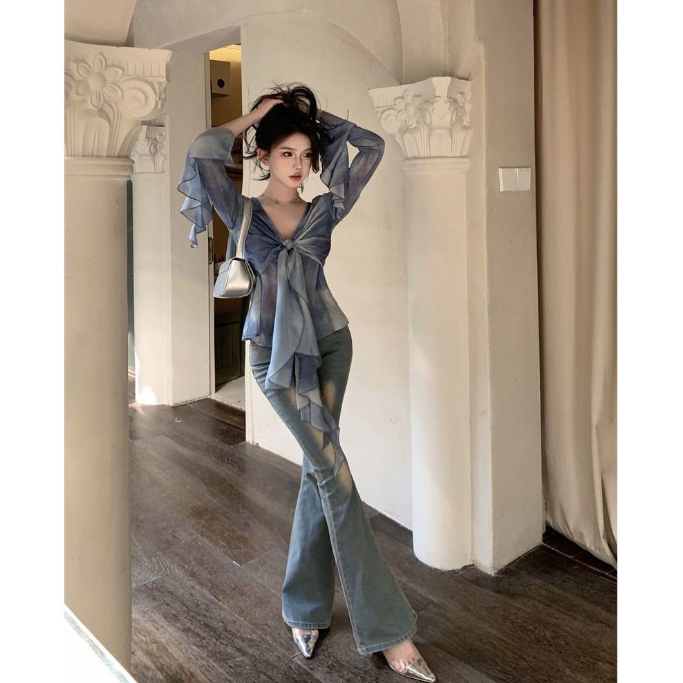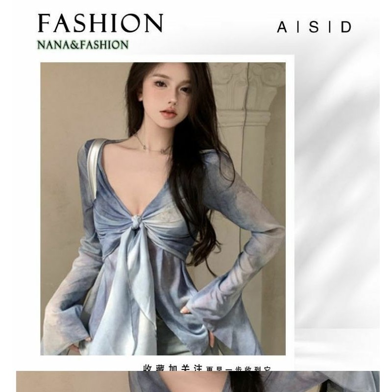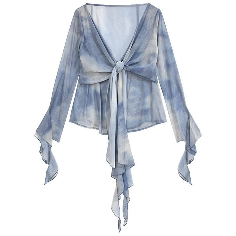 Blue Ruffle Edge & Tie-Dye Long-Sleeve Shirt - Chic French V-Neck | Women’s Summer Top