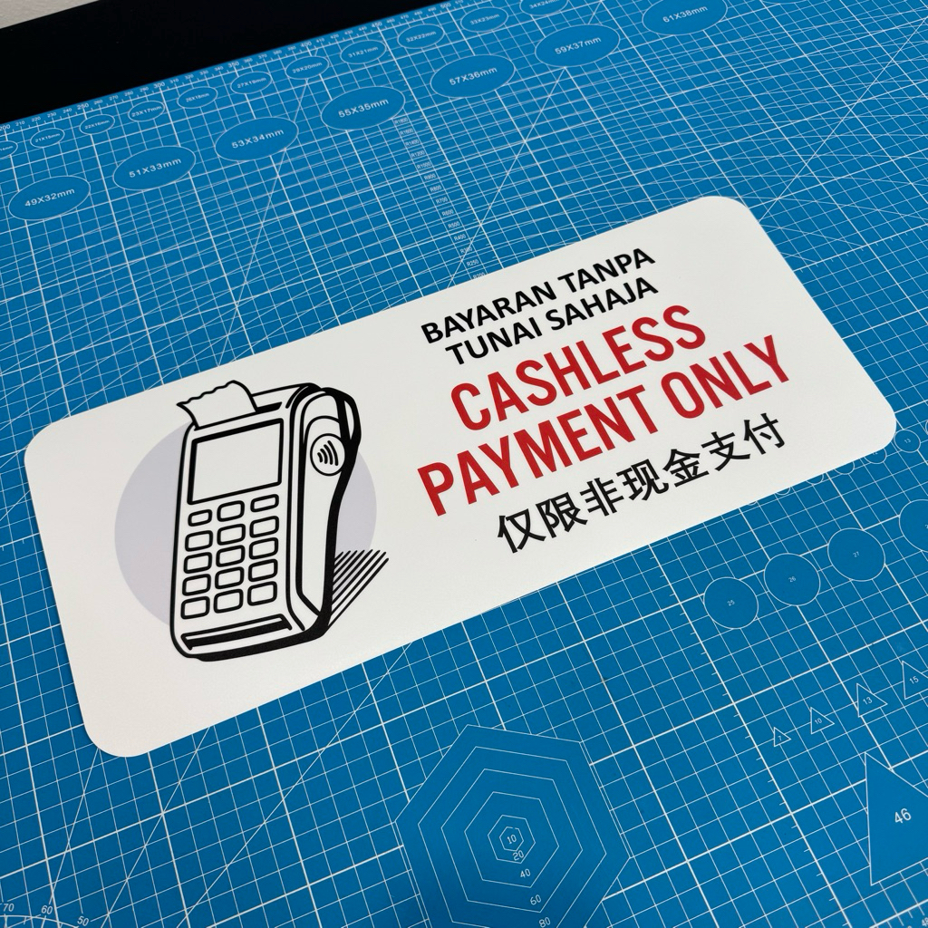 Cashless Payment Only. Bayaran Tanpa Tunai Sahaja. 仅限非现金支付. Sticker Sign Signage Notice. No Cash. QR Pay Credit Card.