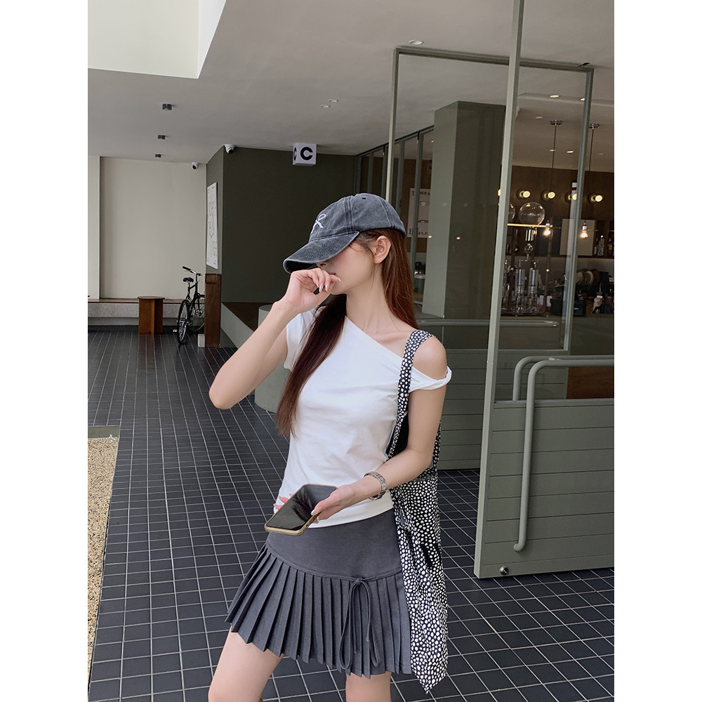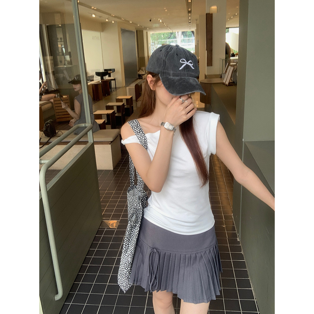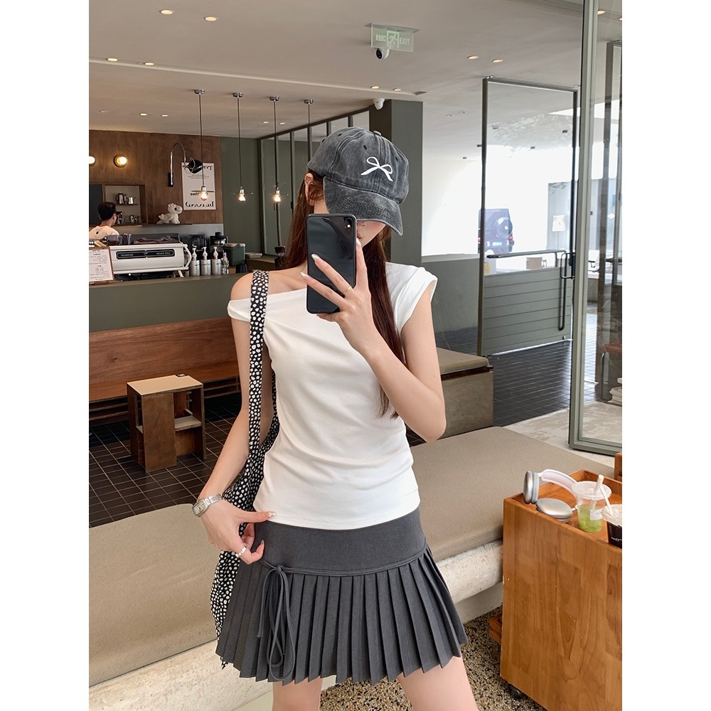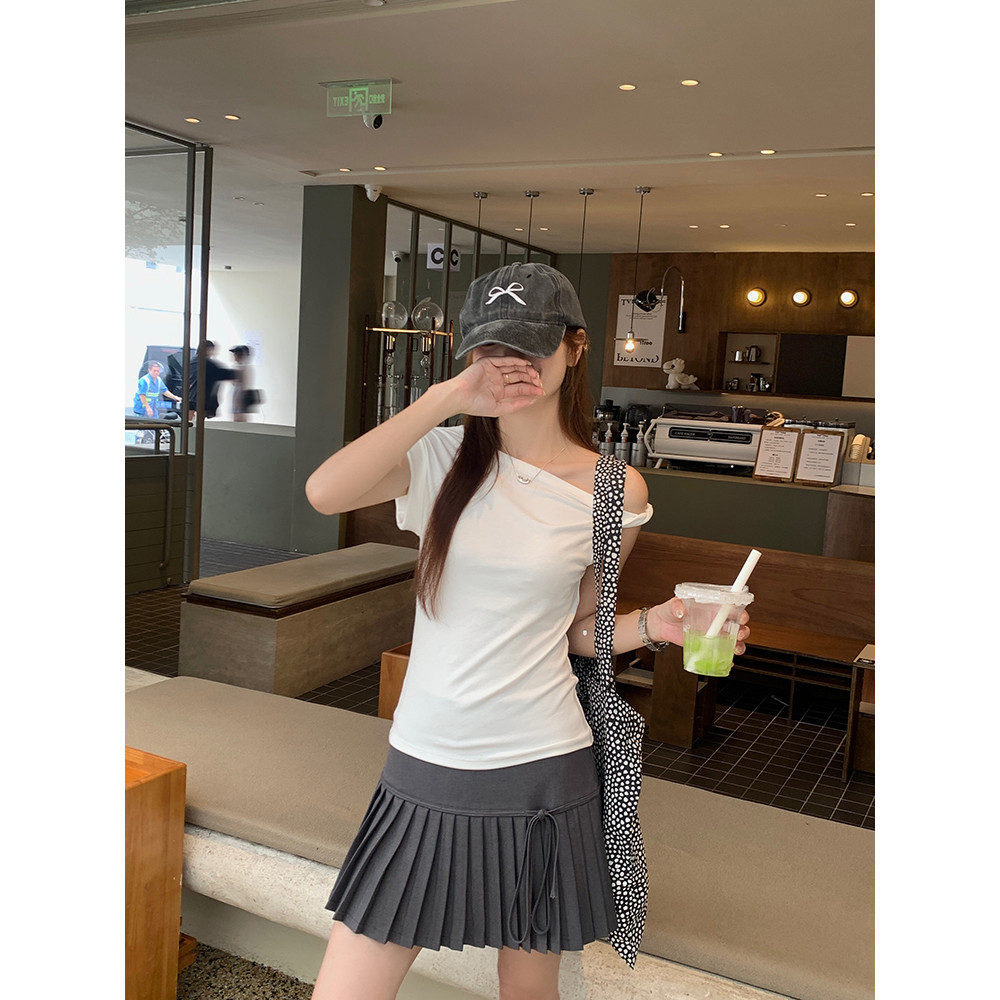 Cherryshop ? Ready Stock ? Cropped Tops For Women Stretch Fabric Pleated Design Short Sleeves Off-shoulder New Style Sexy Skinny T-shirt(White/white)
