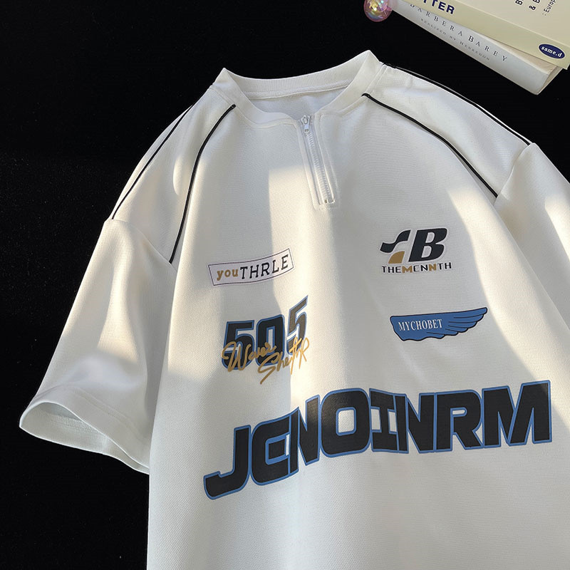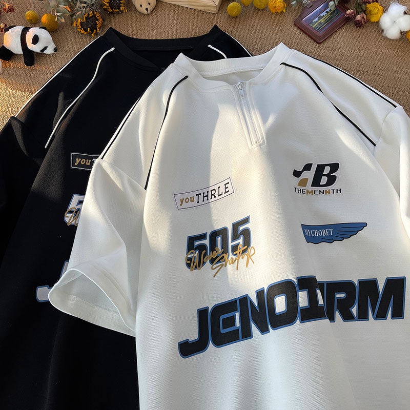 Crush Fashion Korean Mens Oversized Motorcycle Zipper Polo Shirt Summer All-match for Women Trendy Letter Printed Top for Men Loose Round Neck Short Sleeve T-shirt Unisex