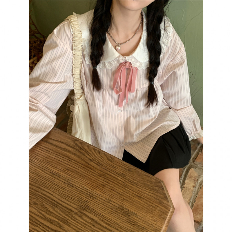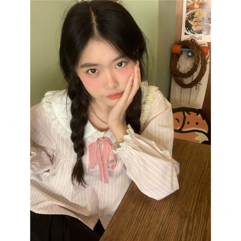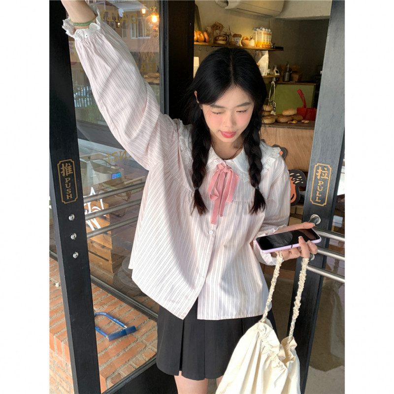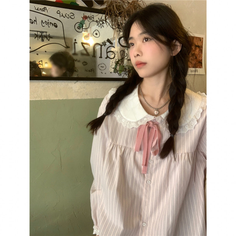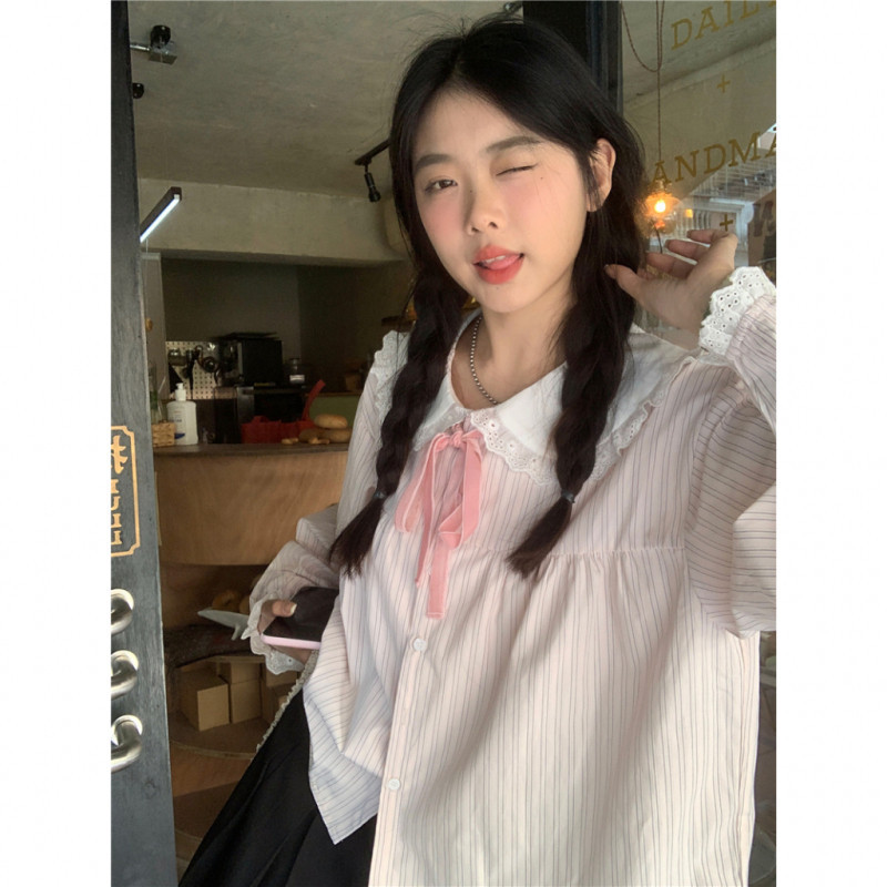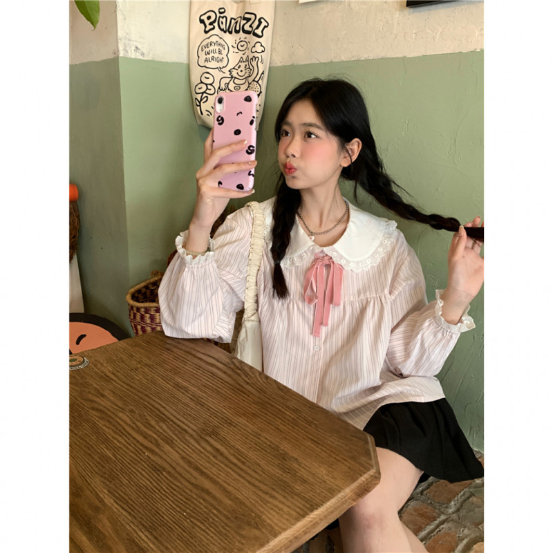 Cute Stripe Blouse Women Korean Style Ladies Loose Long Sleeve Elegant Classy Doll Neck Shirt Top Baju ootd Kemeja Lengan Panjang Perempuan Wanita Terkini Murah Cantik