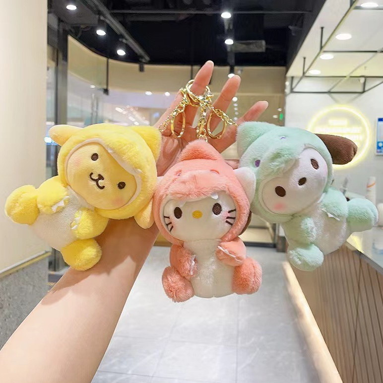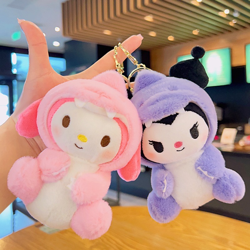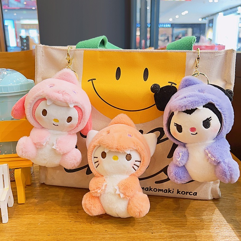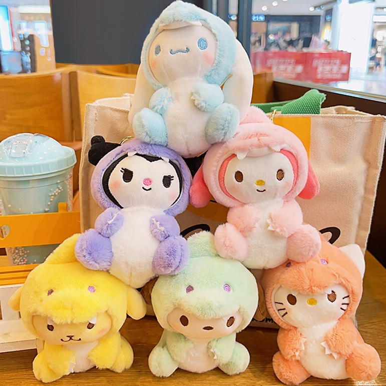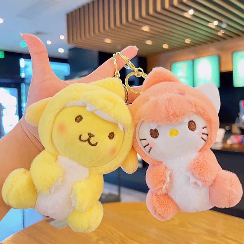 Dinosaurs plush keychain Hello kitty/Cinnamorol/Kuromi/Pochacco/Pom Pom Purin/Melody doll pendant plush toy恐龙库洛米毛绒挂件美乐蒂娃娃公仔玉桂狗玩偶钥匙扣毛绒玩具