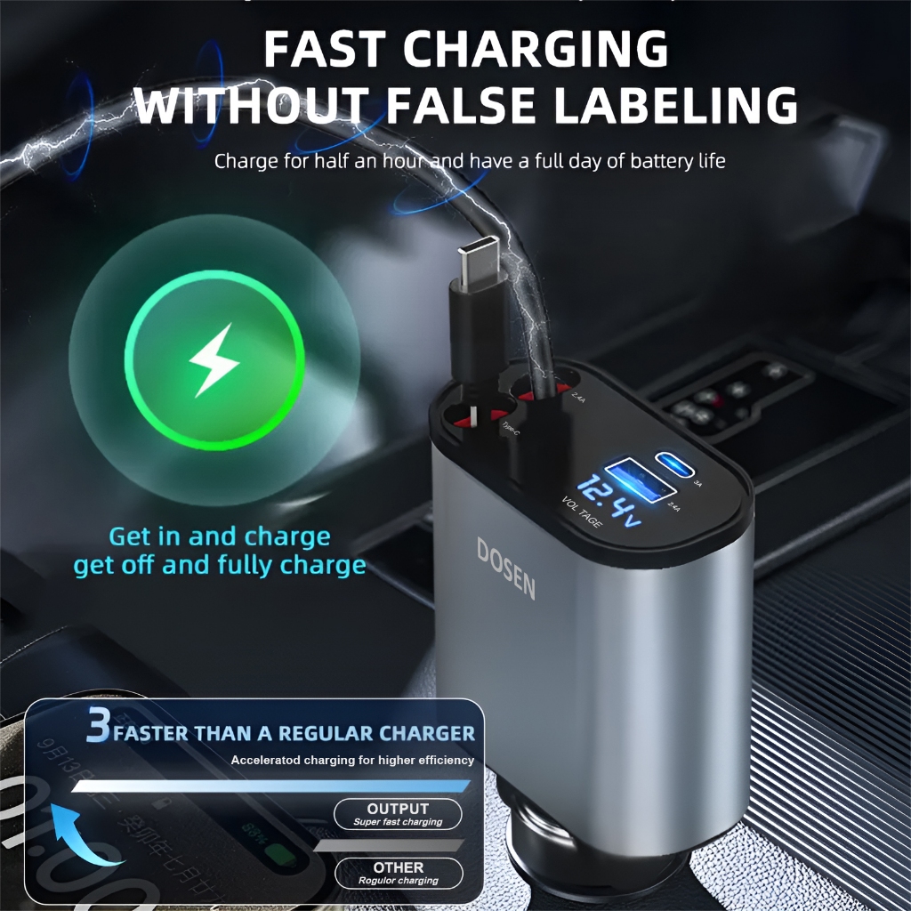 DOSEN Retractable Car Charger 120W 4 in 1 Car Fast Charger Retractable Car Charger IOS dan Type-c