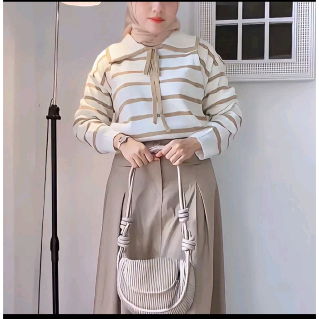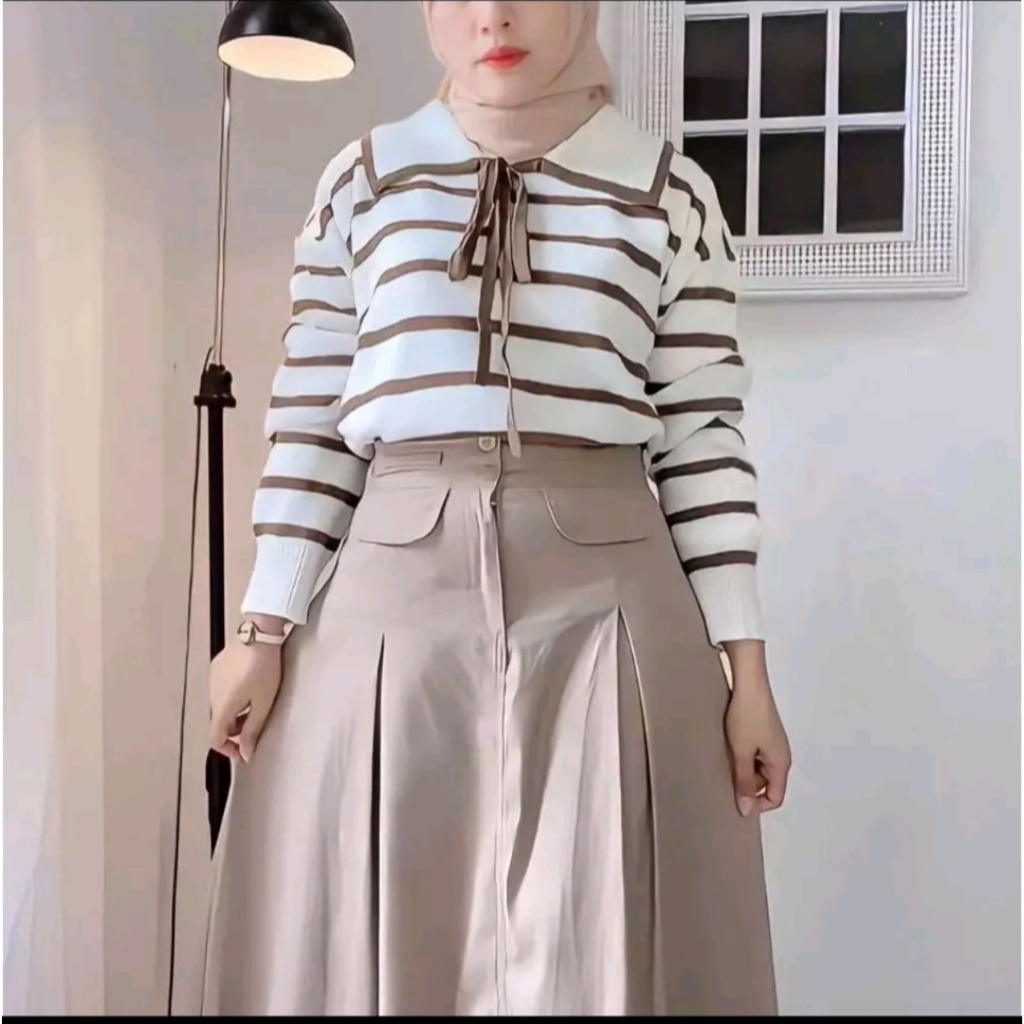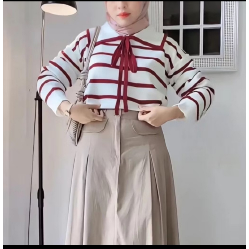 Eily Knitted Sweater Top - Women's Knitted Top with Striped Collar and Long Sleeves
