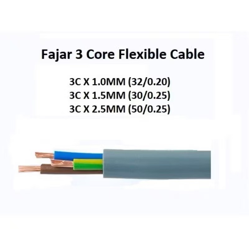 Fajar 1.0MM / 1.5MM / 2.5MM 3 Core Flexible Cable Core 100% Pure Copper with SIRIM (90M Per Roll)
