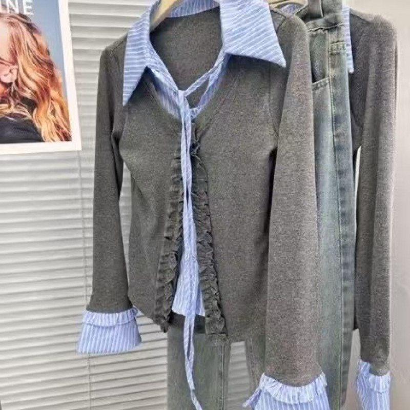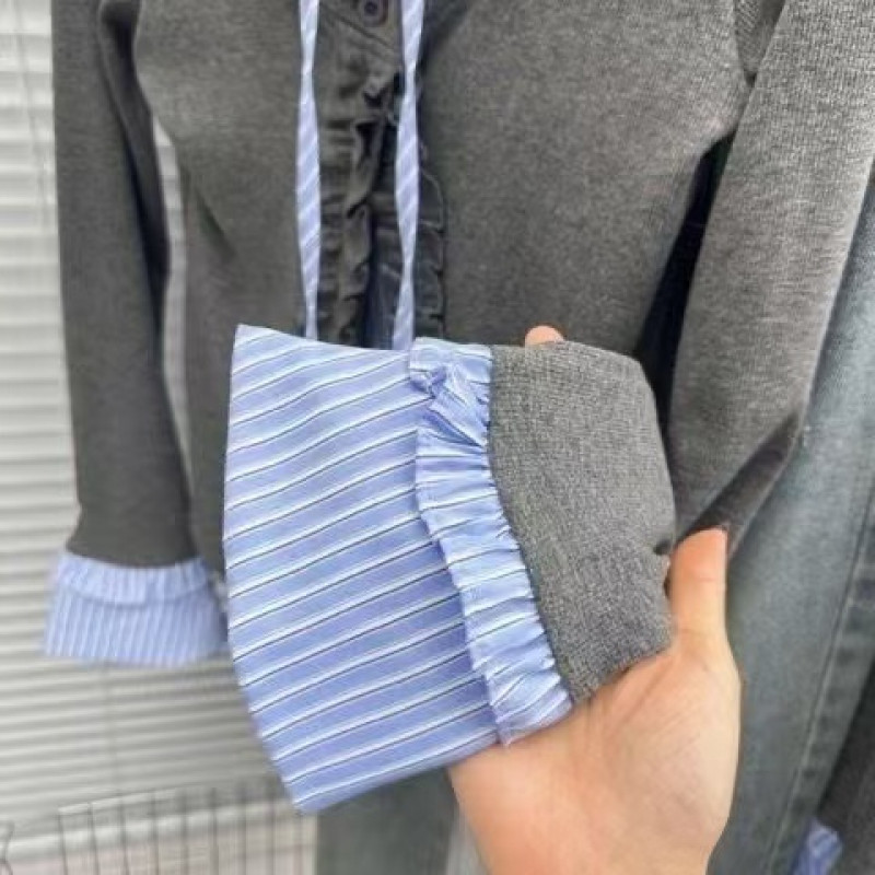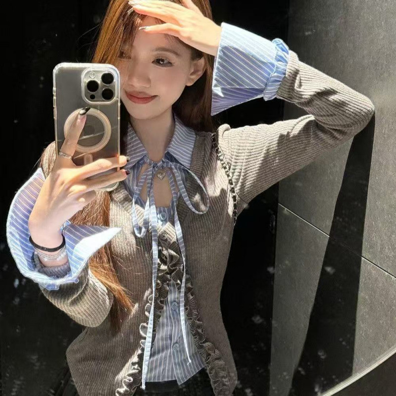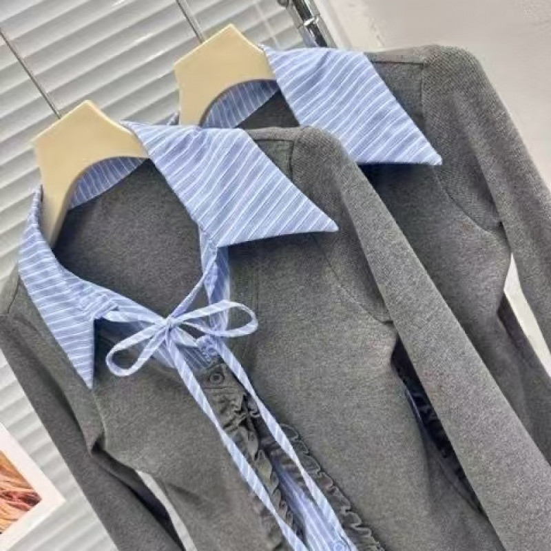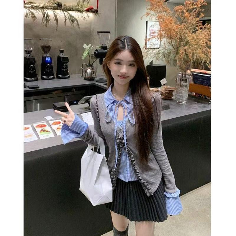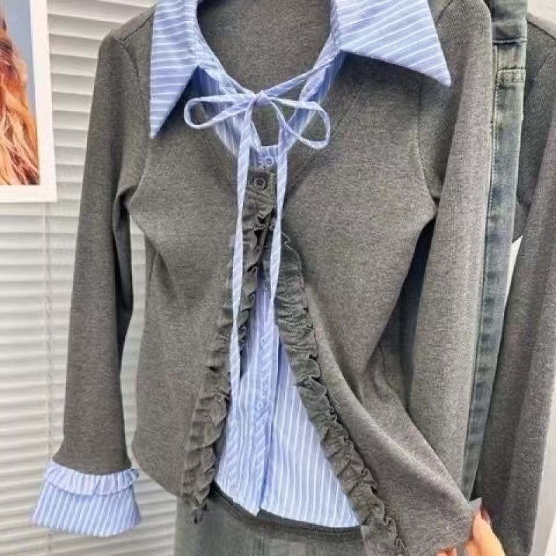 Fake-2-piece Blouse Women Ruffle Long Sleeve Korean Style Ladies Slim Shirt Top Grey Baju ootd Kemeja Lengan Panjang Perempuan Wanita Terkini Murah Cantik Kelabu