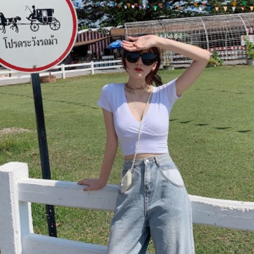 Fashion Women Floral V-neck Short Sleeve Crop Top【07】