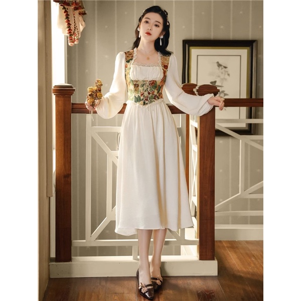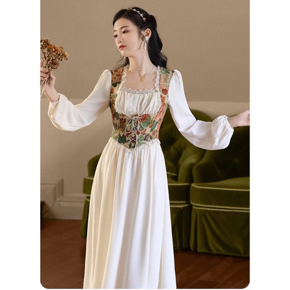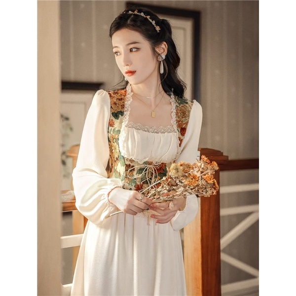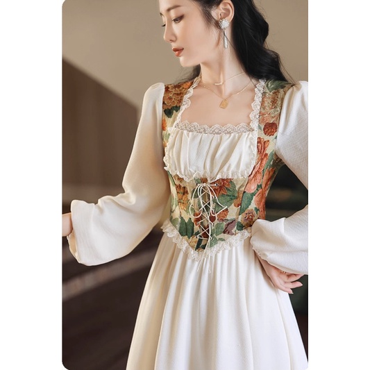 Fashionable Romantic Splice Retro Oil Painting Dress Square Neck Sweet Long Sleeve French Fairy Dress