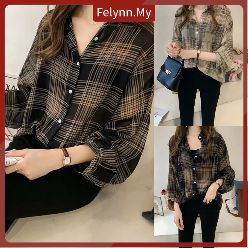 【Felynn.My】Korean Style Lapel Plaid Shirt for Women Casual Loose Long Sleeve Blouse Plus Size Top