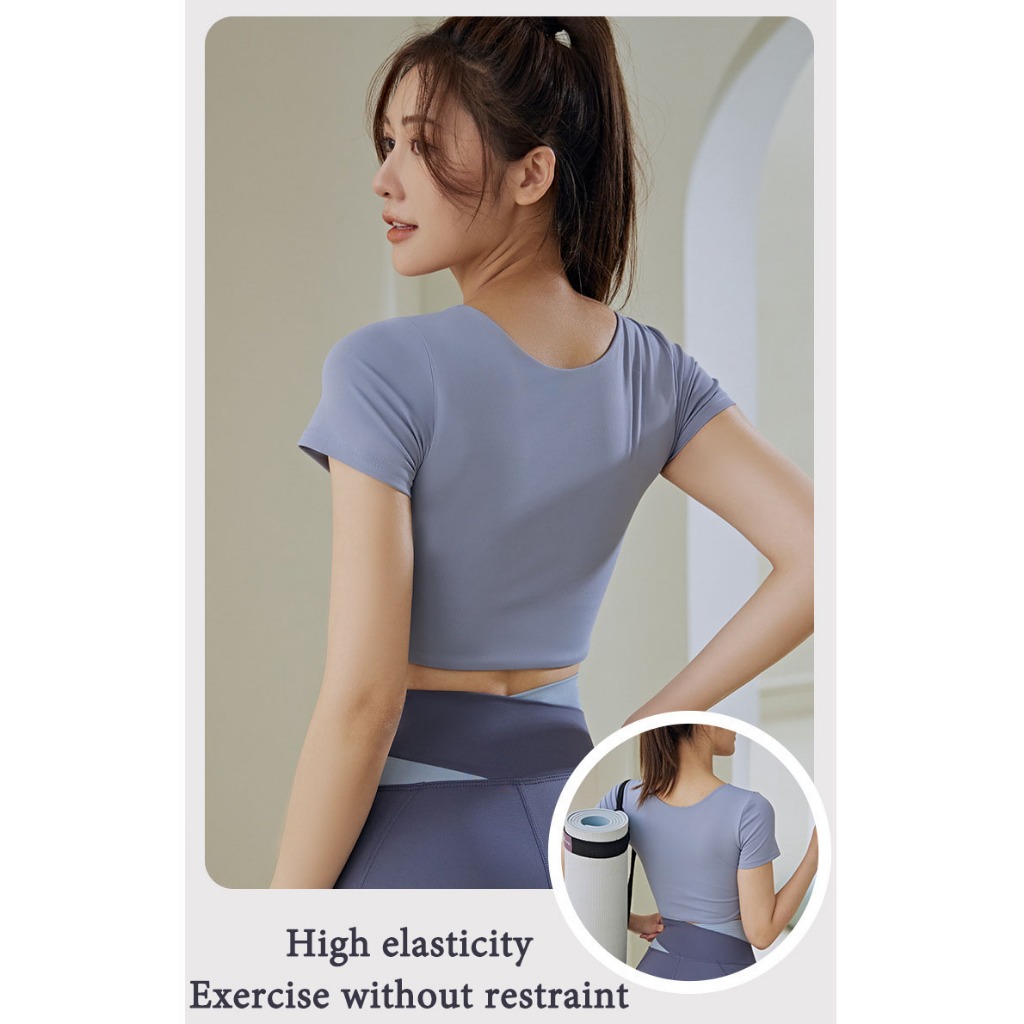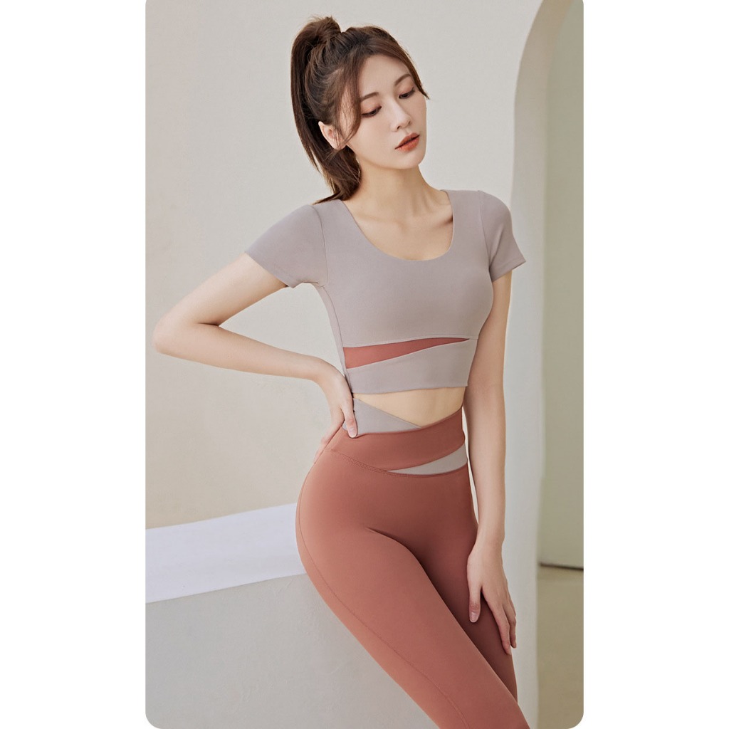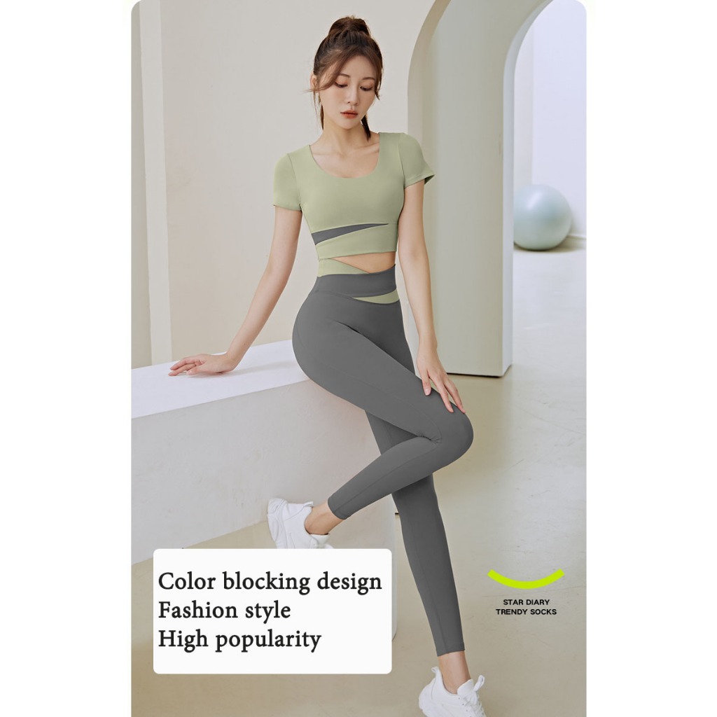 Flyblue Stitching Contrast Color Yoga Suit Women's Spring Summer Navel-Exposed Short-Sleeved High Waist Hip-Lifting Running Sports Fitness