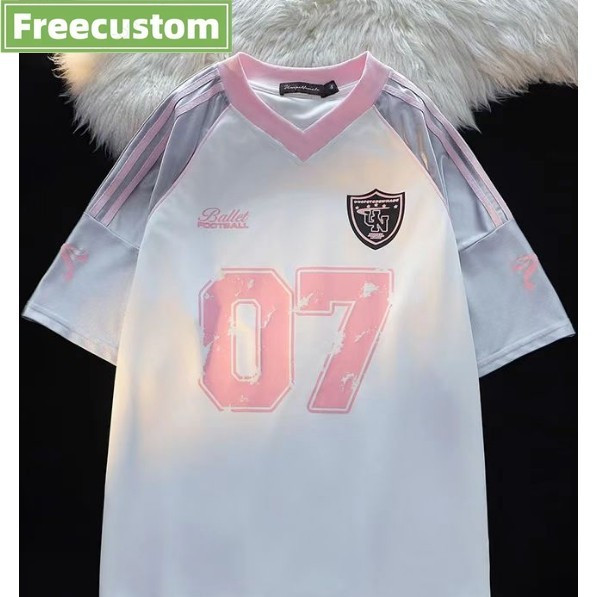 【Free Custom Name & Number】Oversized American Style Shoulder Patch Short Sleeved T-shirt Women Summer Silver Top Half Sleeved Couple V-neck Sports Jersey