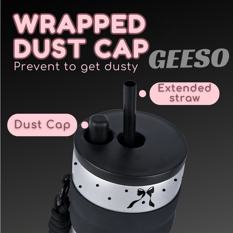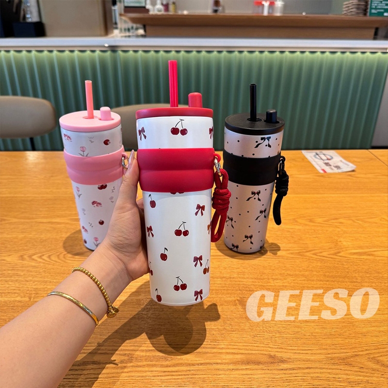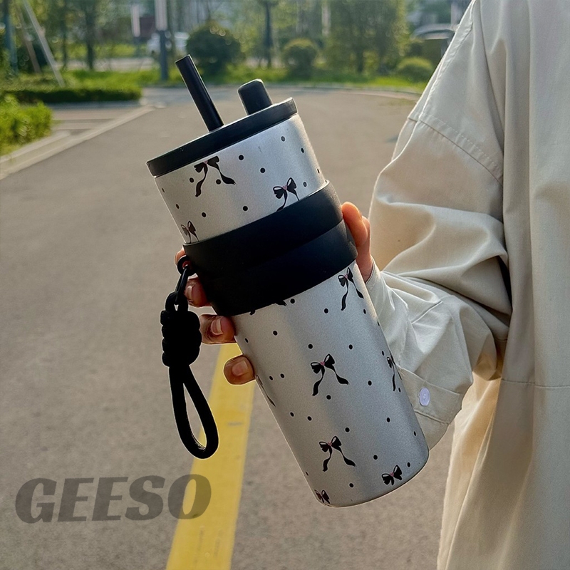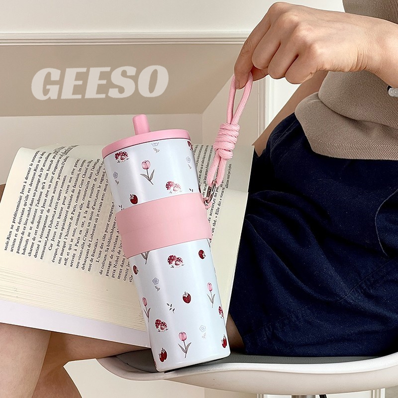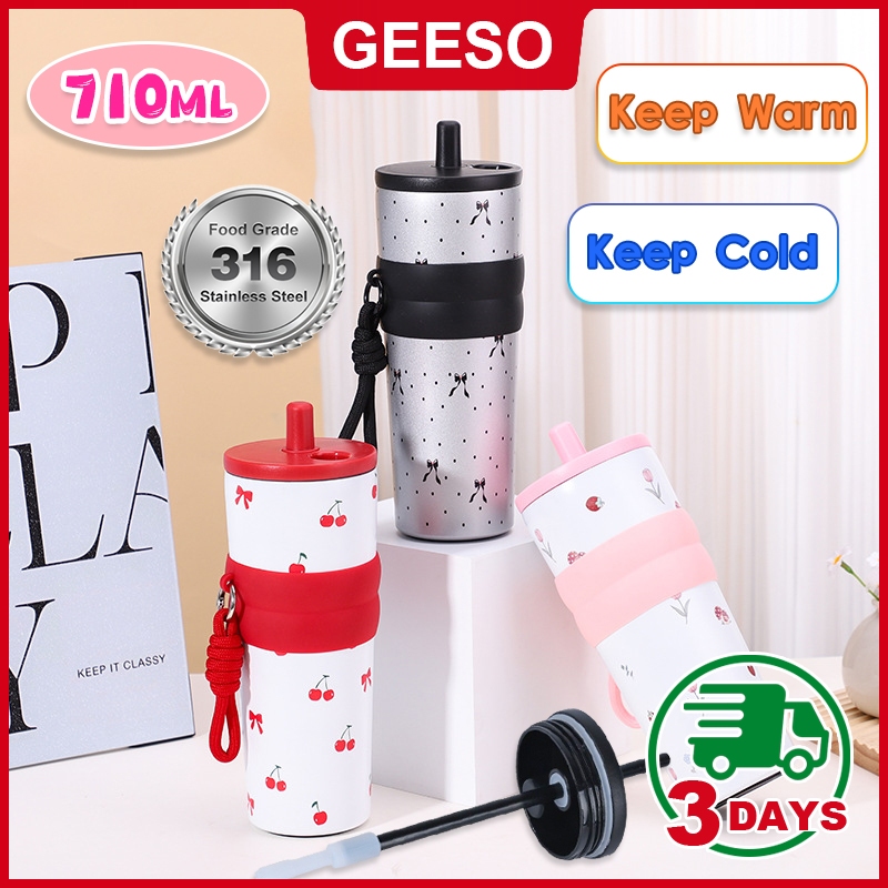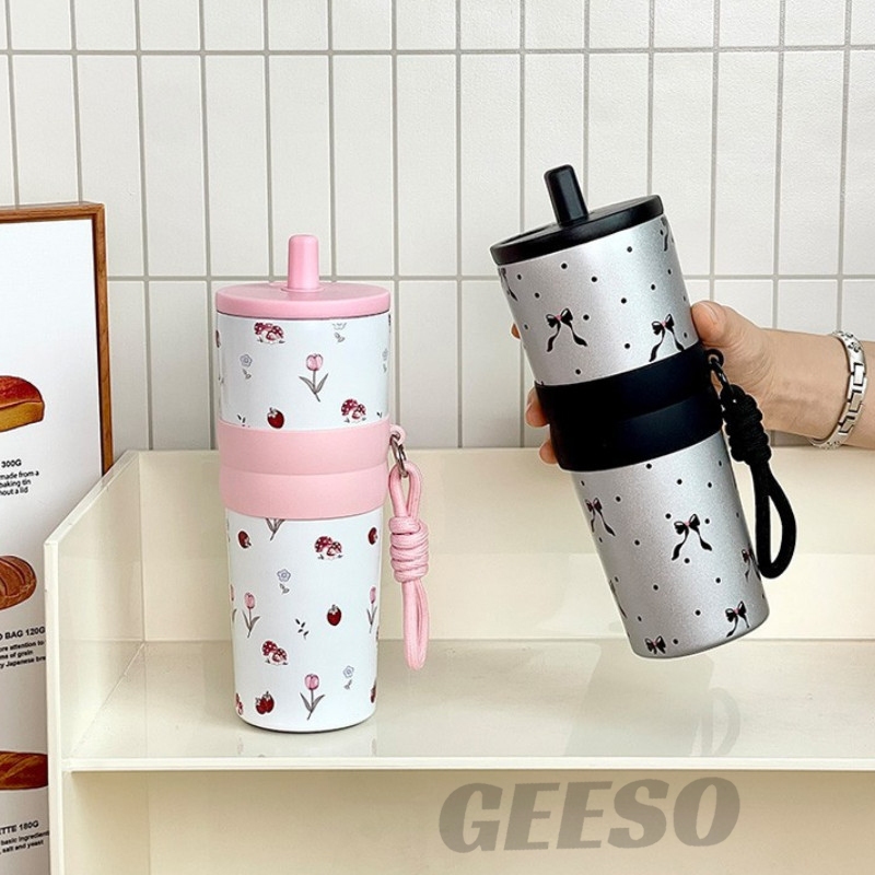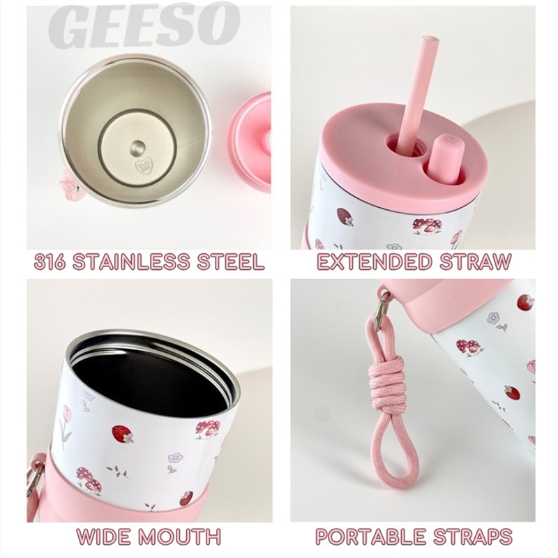 GEESO Cute Tumbler 710ML with Straw 316 Stainless Steel Thermos Water Bottle Leak-Proof Insulated Botol Air Comel Flask 小清新吸管杯