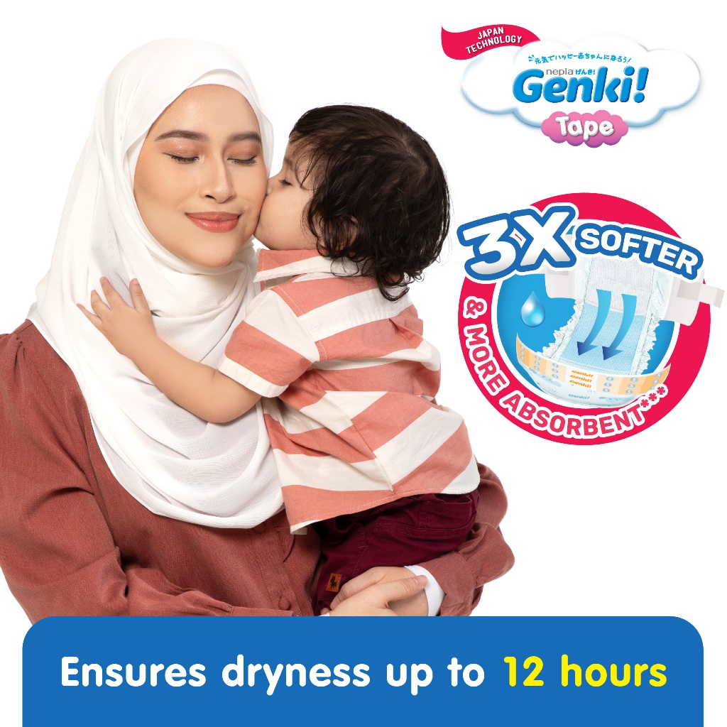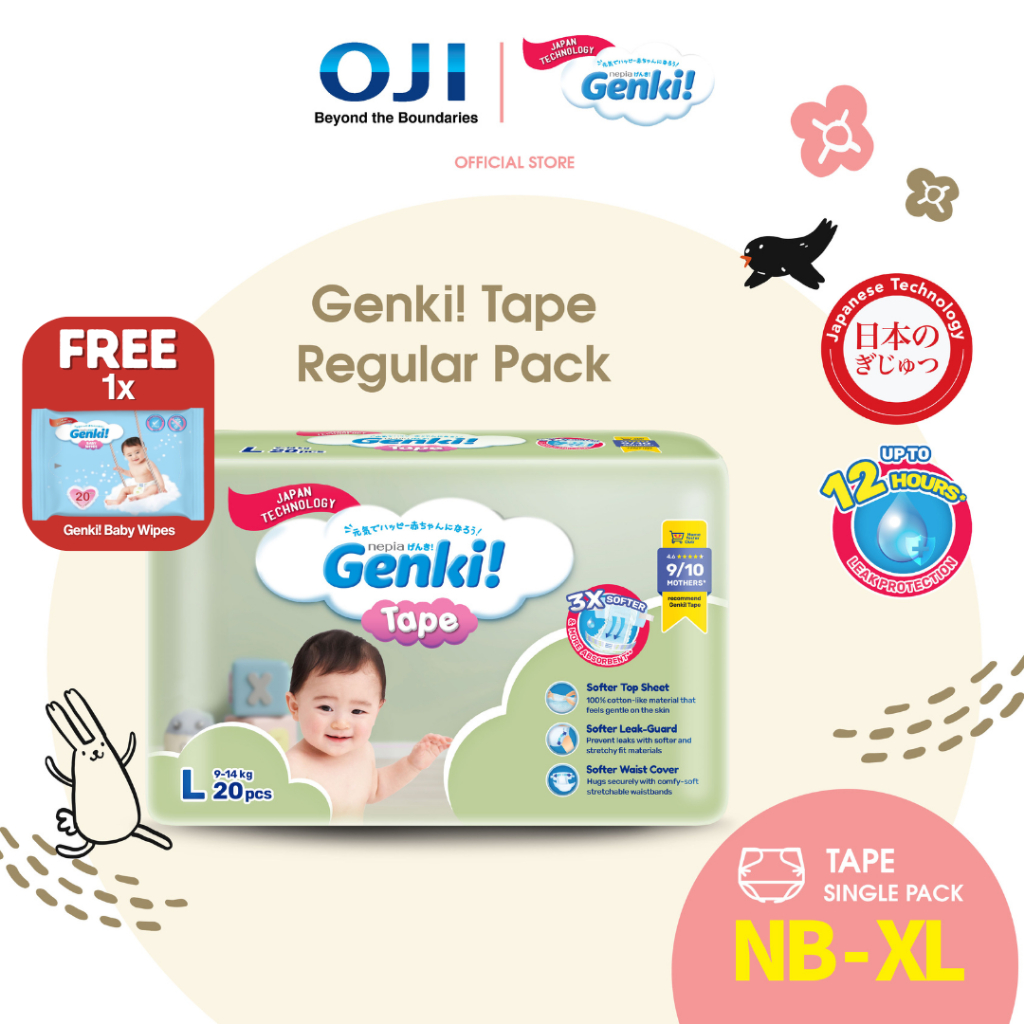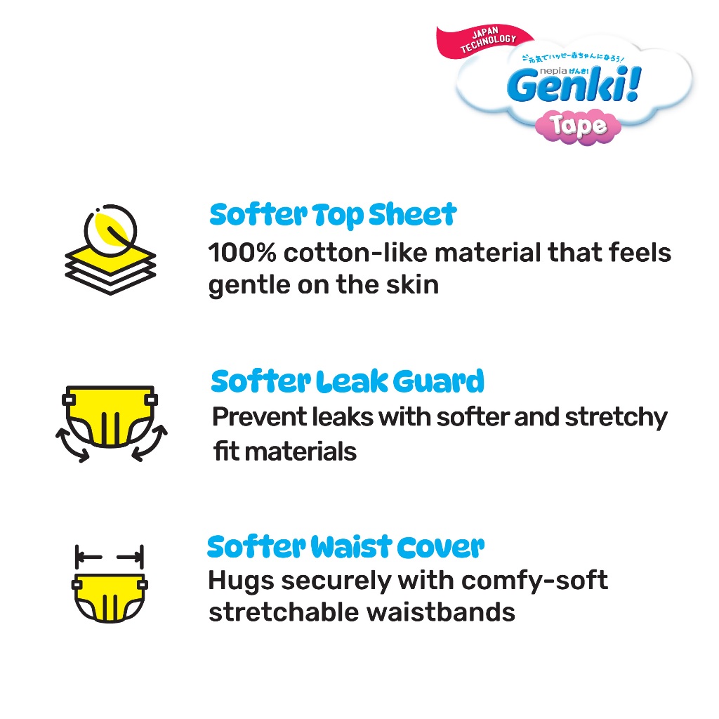 Genki! Regular Tape Diapers Baby - Size NB (28's)/S (28's)/M (24's)/L (20's)/XL (18's)