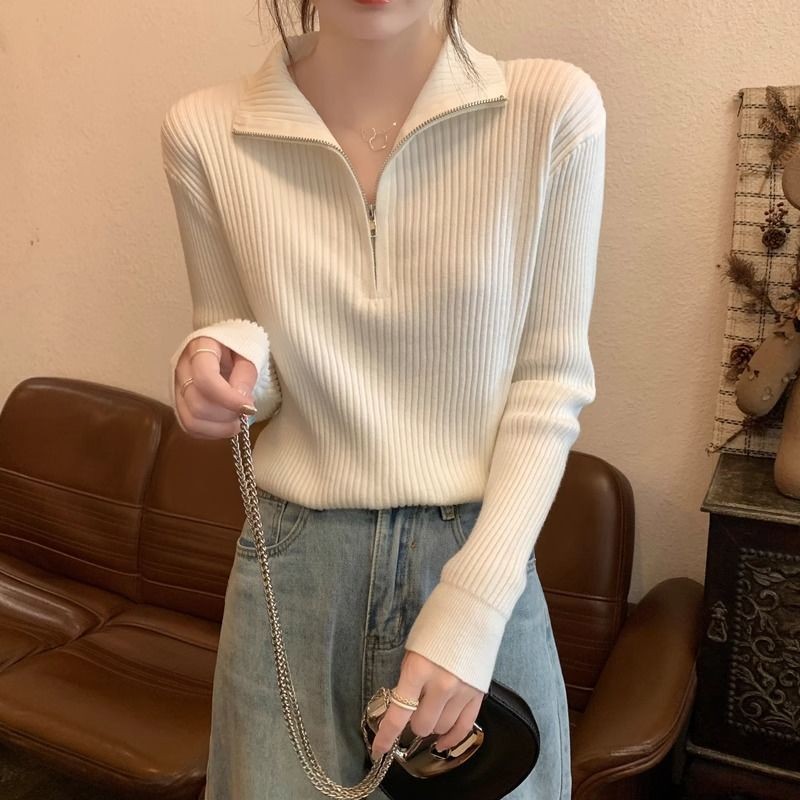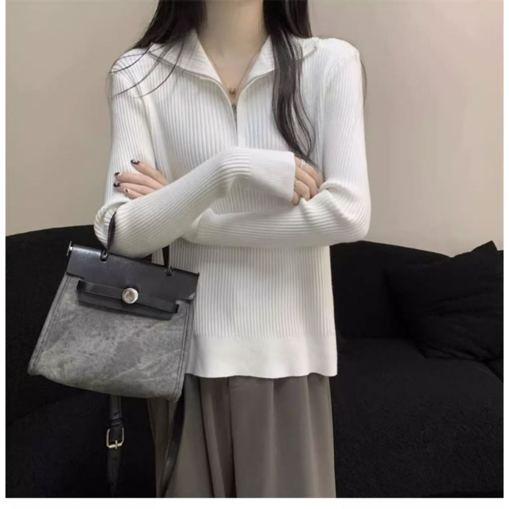 ?GHIIO? [ready stock in Malaysia] Knit Sweater Loose Sleeve Zipper Basic Korean Fashion Women Ladies Versatile Plain Color Long Sleeve Collar Knitwear Blouse baju 10 colors