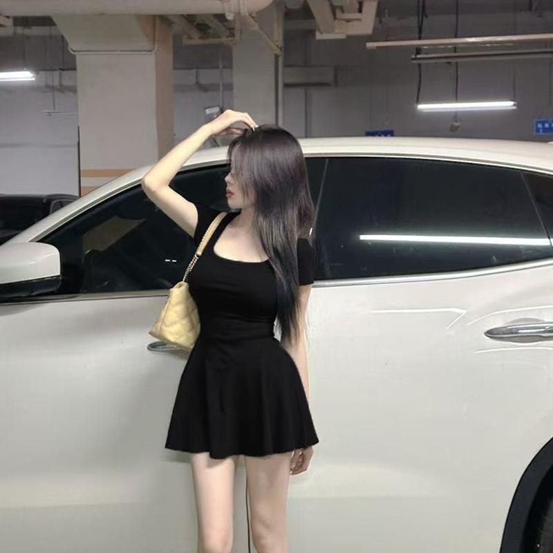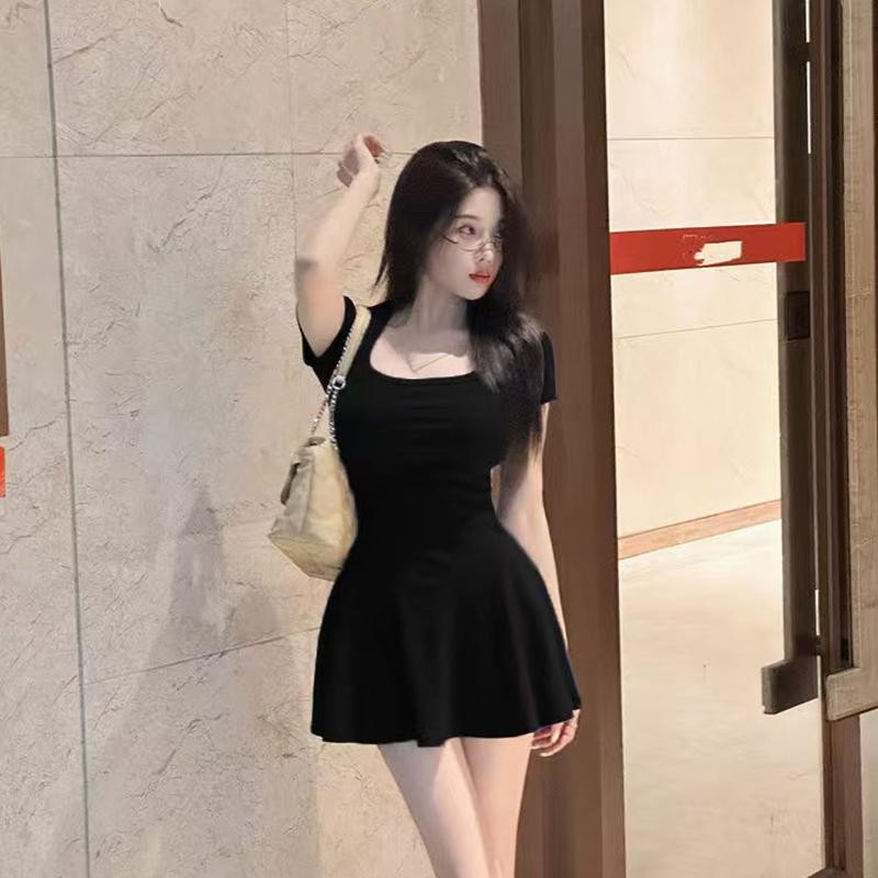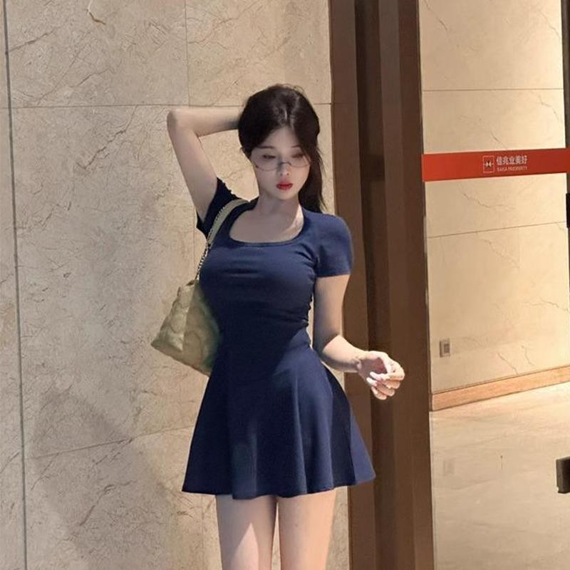 girl square neck dress for women in summer, with a short waist and slimming temperament, A-line elastic short skirt