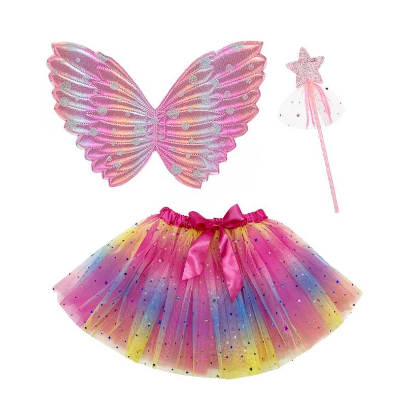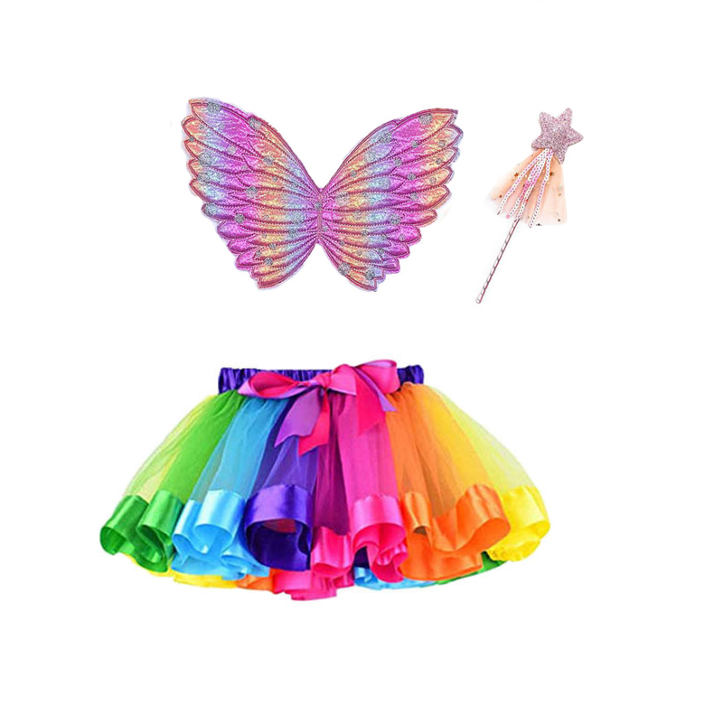 Girls Rainbow Tutu Skirt Butterfly Wings and Wand Costume Kids CosPlay Party Fairy Wings Dress Up Tutu With Angel Wand