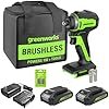 Greenworks 24V Brushless Cordless Impact Driver Kit, 1950 in./lbs Torque, 1/4'' Hex Collet, Variable Speed, 2×2Ah Batteries with 2A Charger, LED Light, 8pcs Drill/Driver Bits with Tool Bag