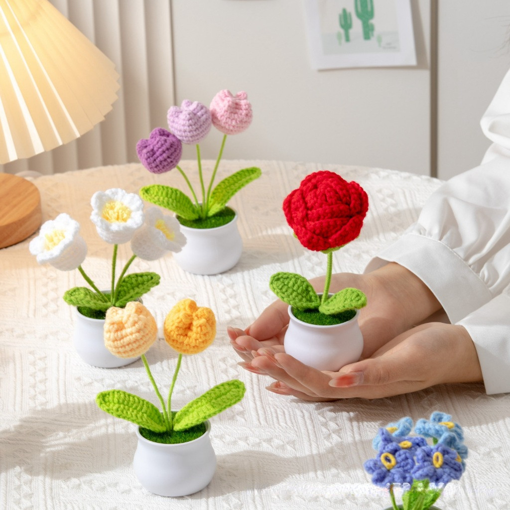 Hand-Woven Cute Crochet Flower For Mini Knitted Flower Orchid Daisy Tulip Potted Flower for Home Office Tables Decoration