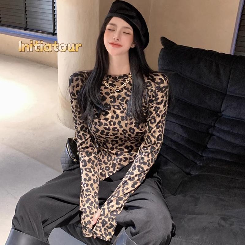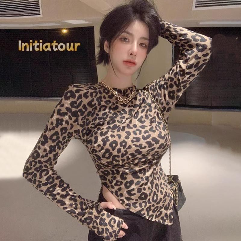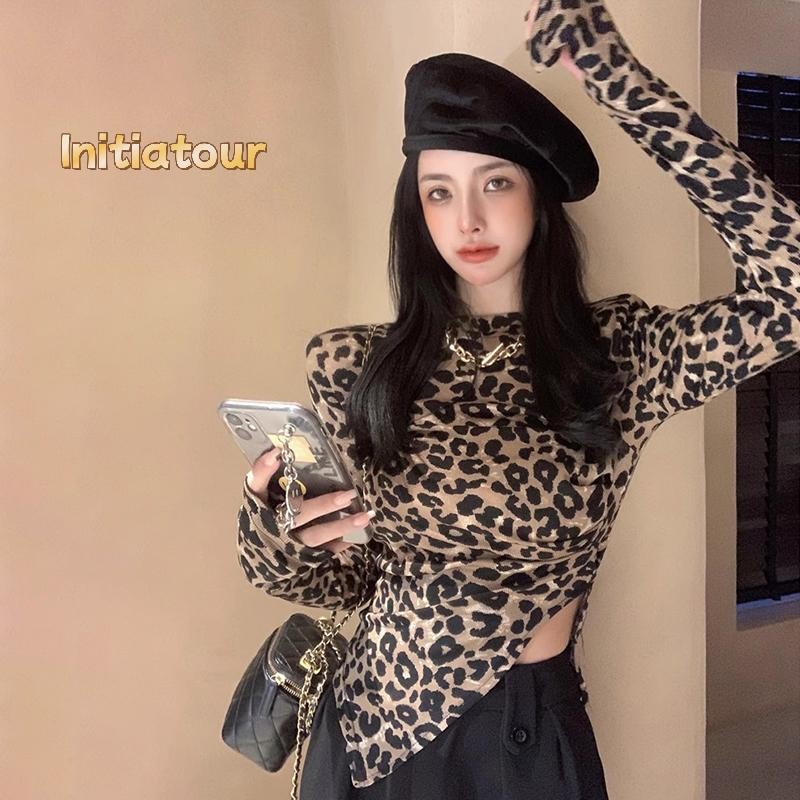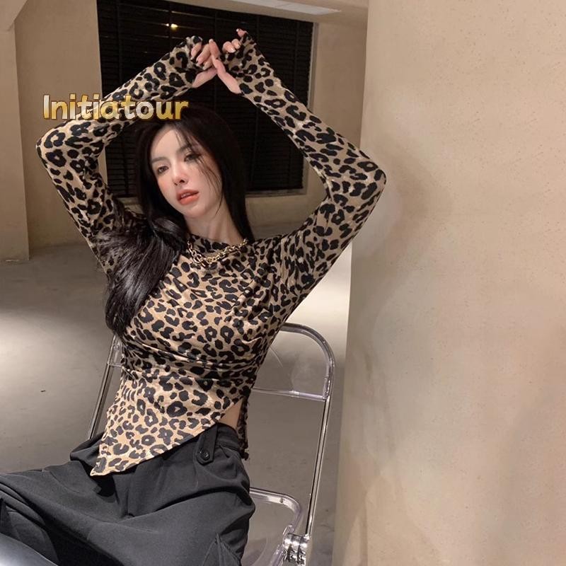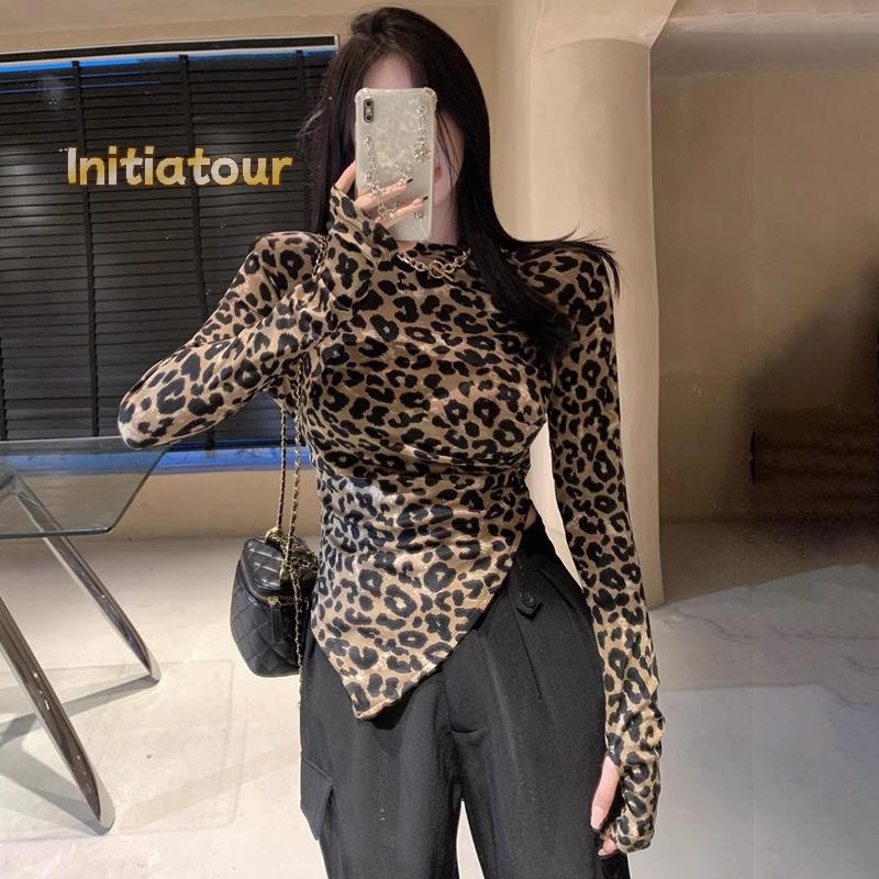 [Initiatour-t] American Sexy Leopard Printed Round Neck Long Sleeve Irregular Slim T-shirt For Women