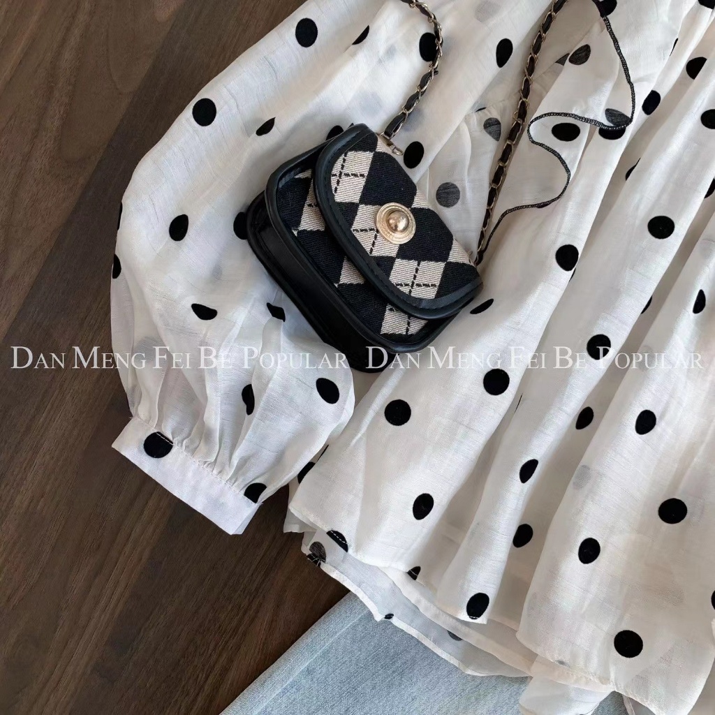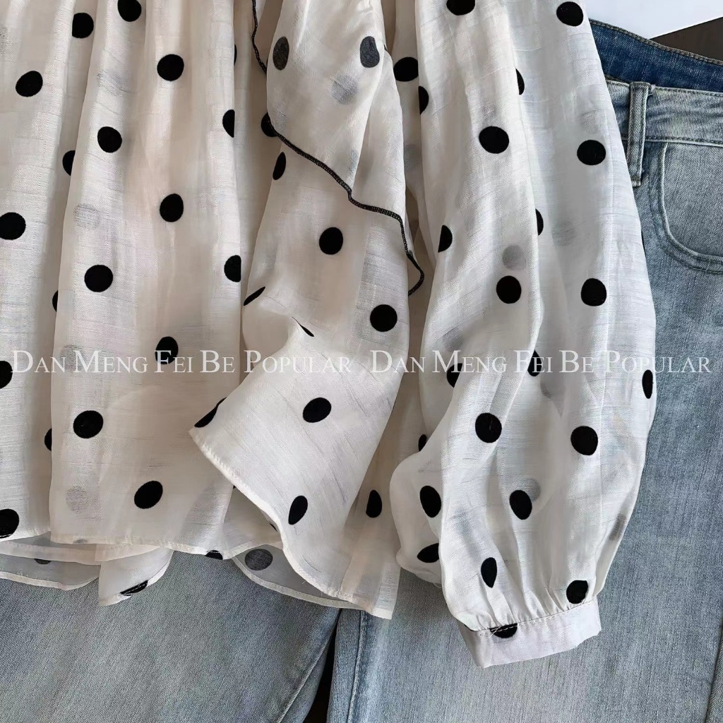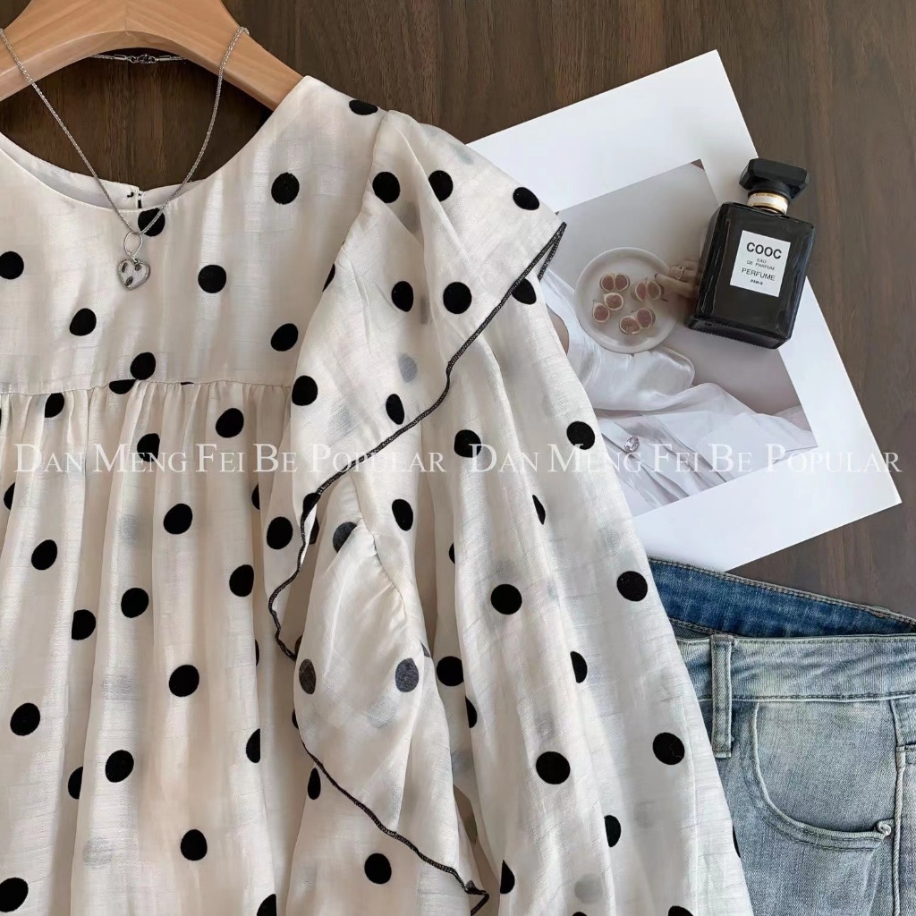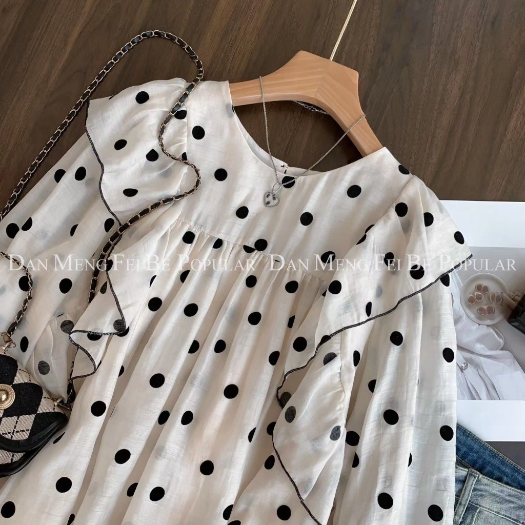 Korea Women Fashion Polka dots retro long sleeve loose round collar ruffle blouse