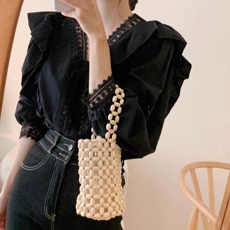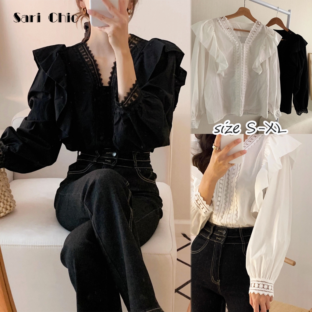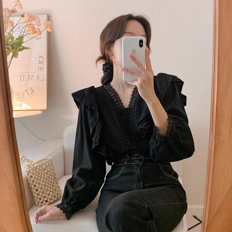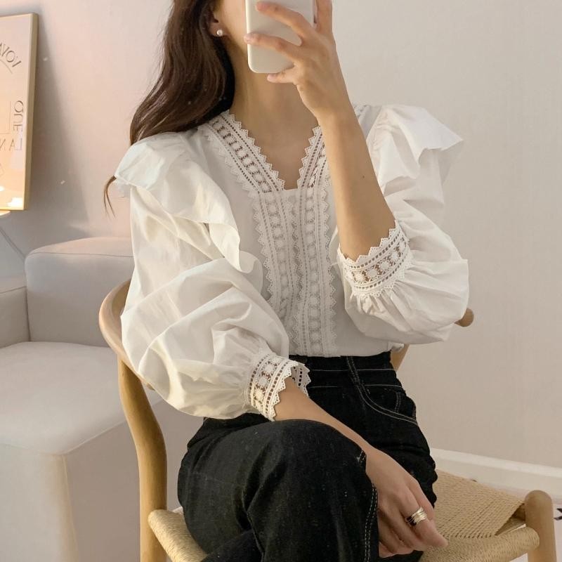 Korean Chic French Style Lace Lace V-neck Patchwork with Ruffle Edge Loose Casual Bubble Sleeve Shirt W608