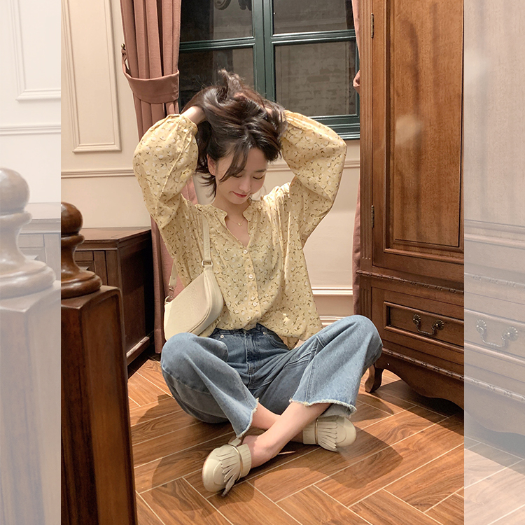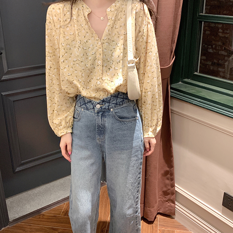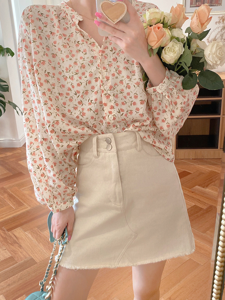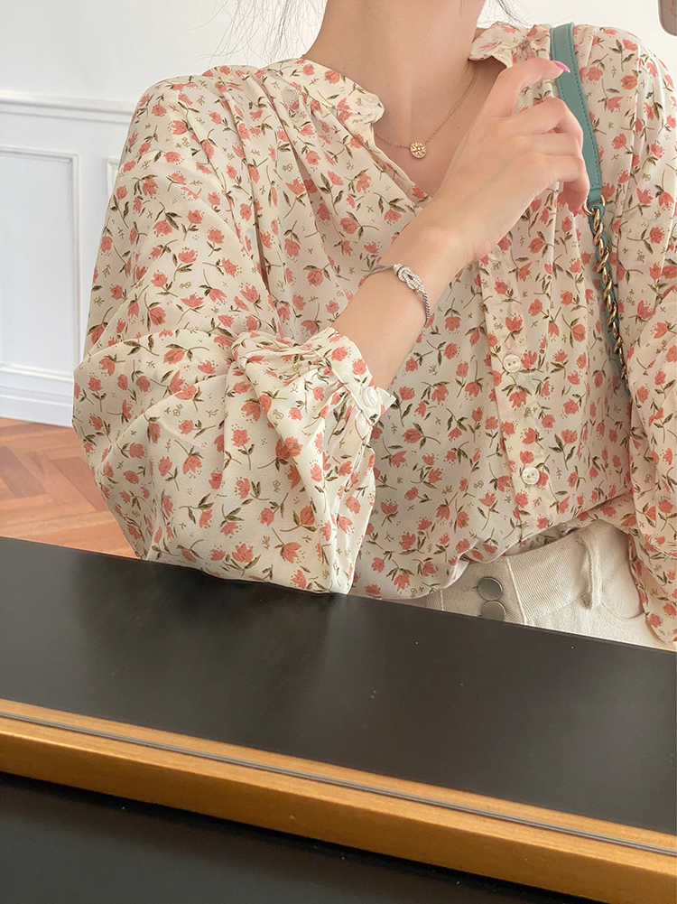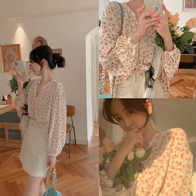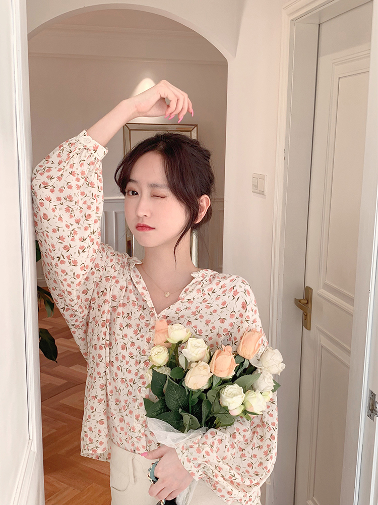 korean fashion women long sleeve floral print chiffon square neck shirt blouse tops