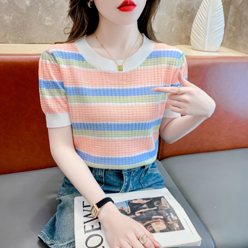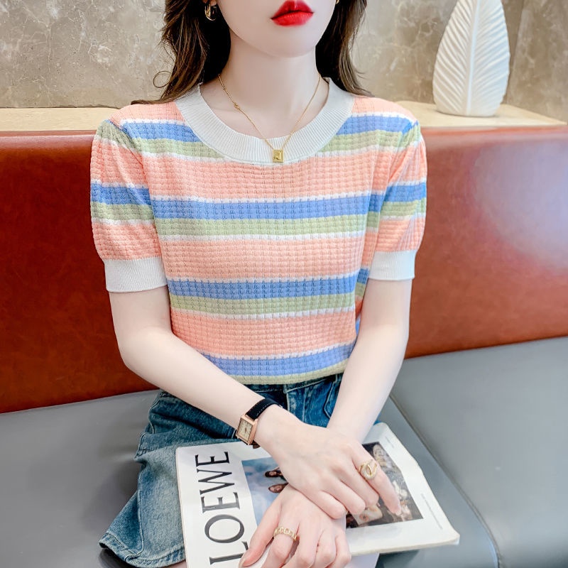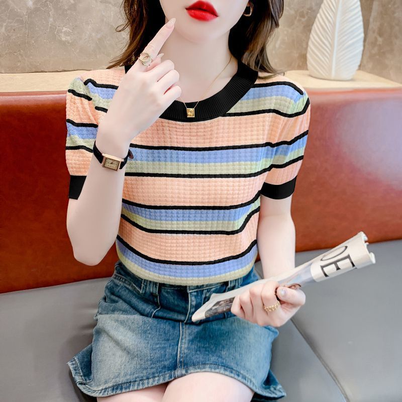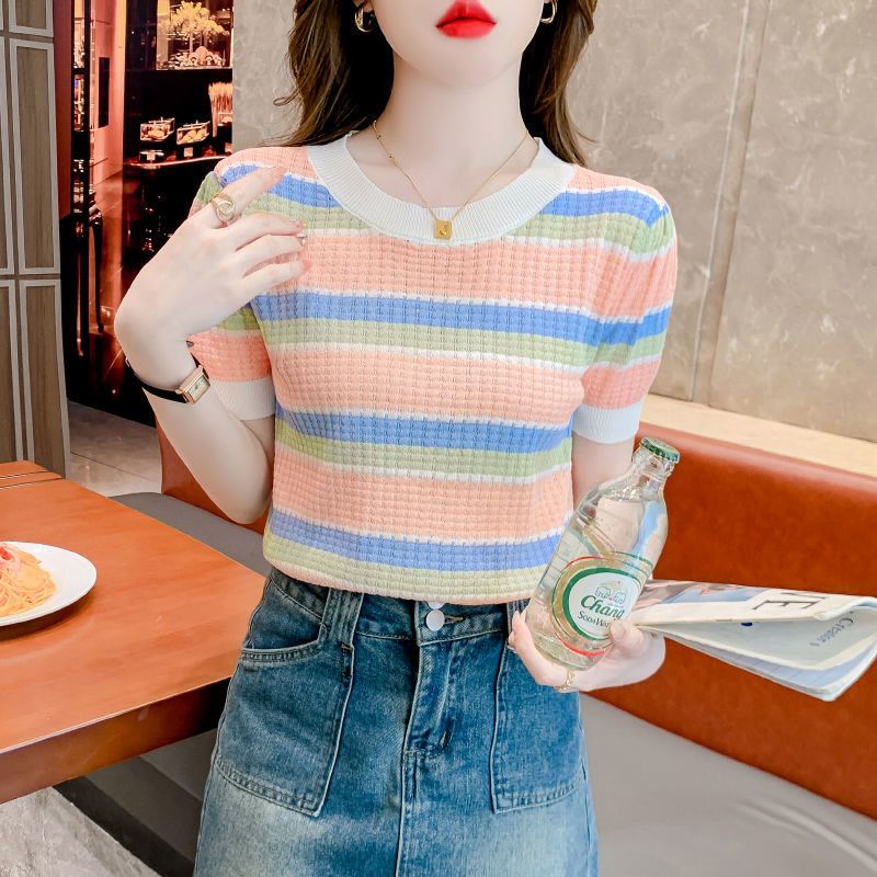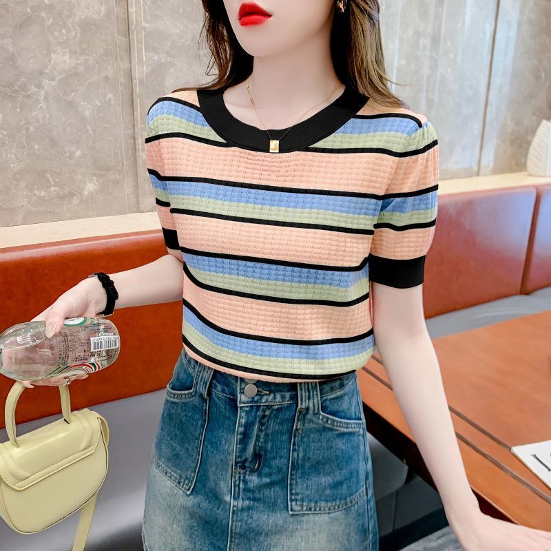 Korean Gentle Stripe Knitted Short Sleeve T-shirt韩系温柔条纹针织短袖T恤女2023夏季新款圆领撞色设计感短款上衣11.20