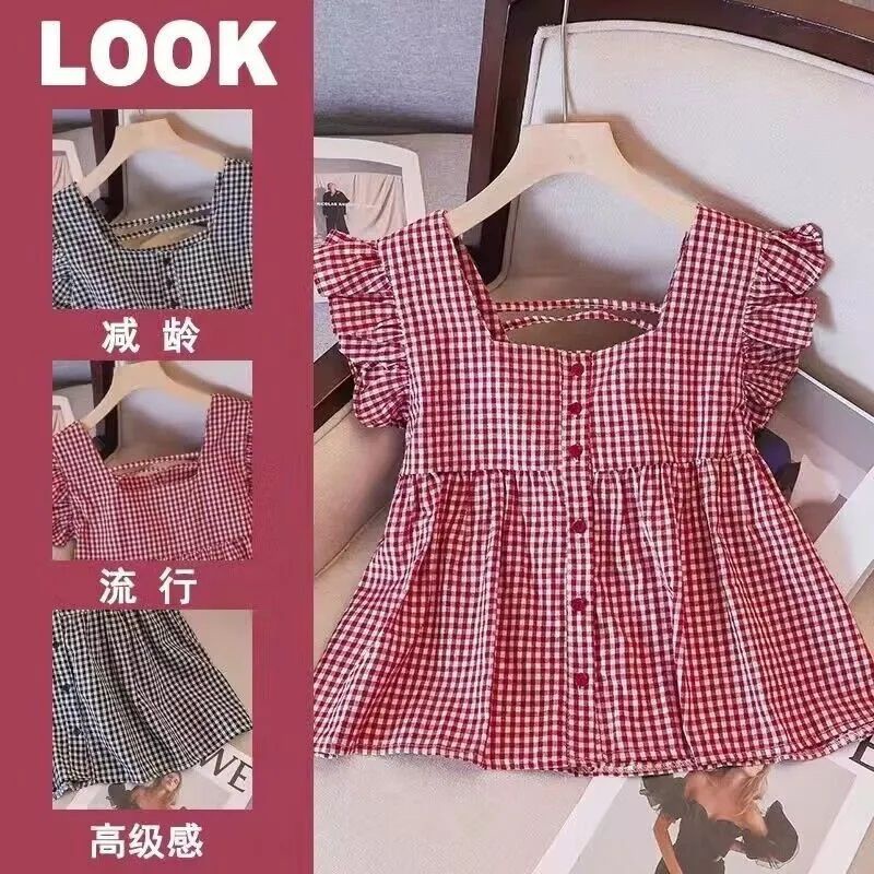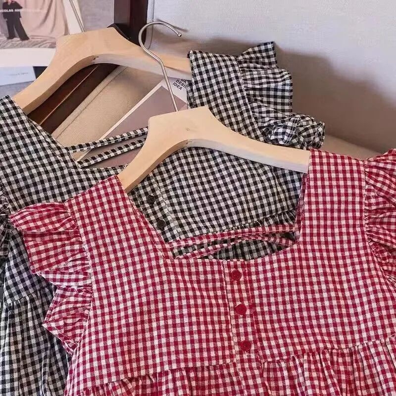 Korean Style Women Cute Sleeveless Tops Square Neck Cutton Blouse Cool Plaid Shirt