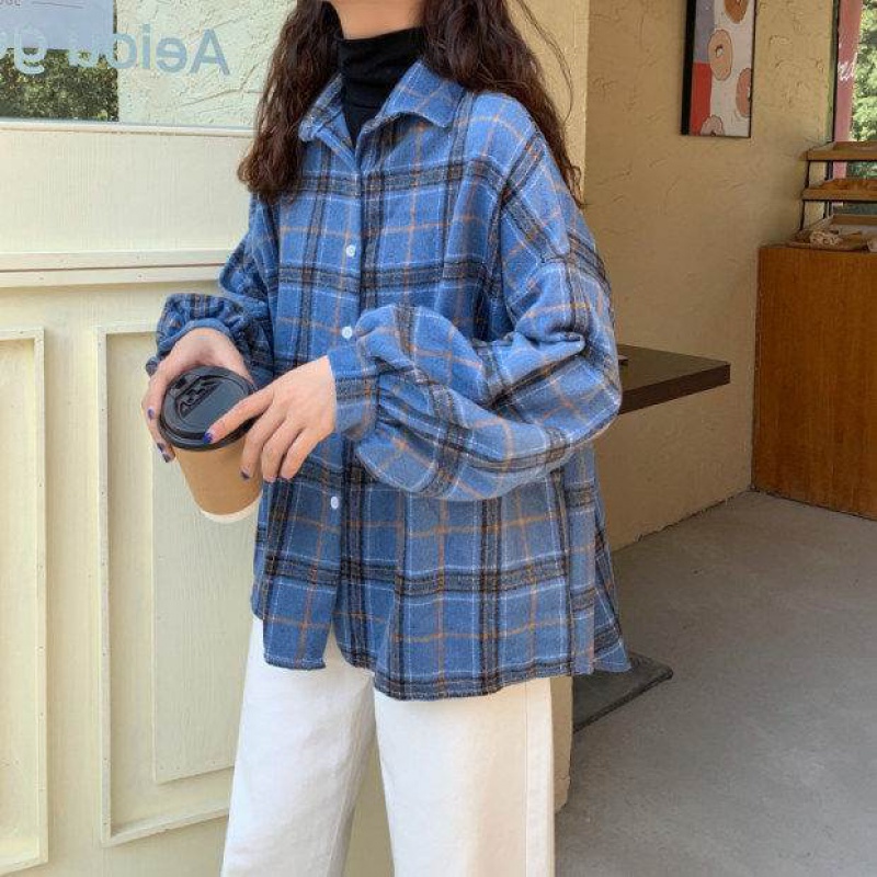 Korean Style Women Ladies Loose Retro Plaid Oversize Long Sleeve Shirt Blouse Baju Baju Wanita Lengan Panjang