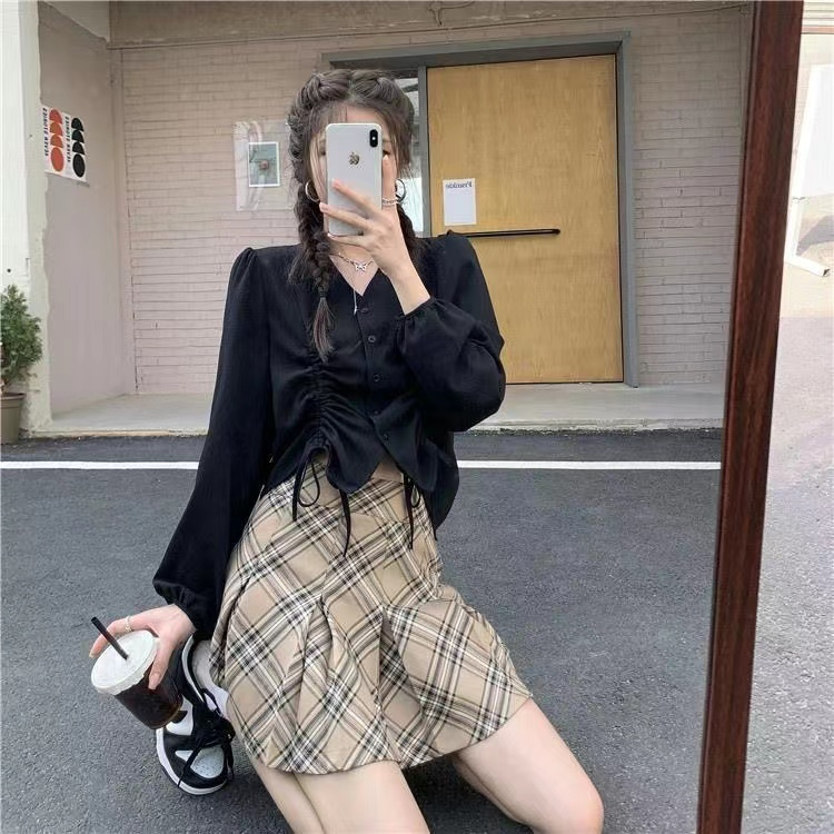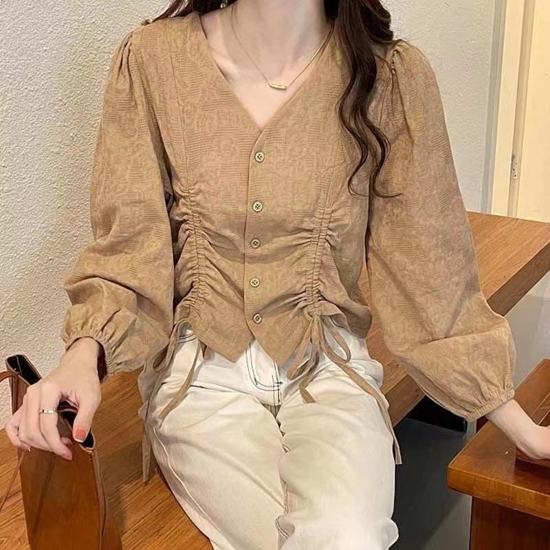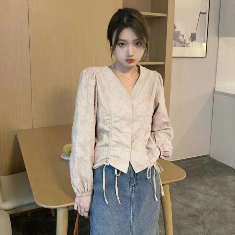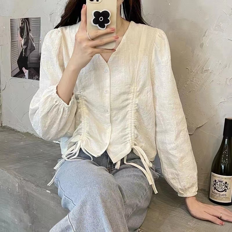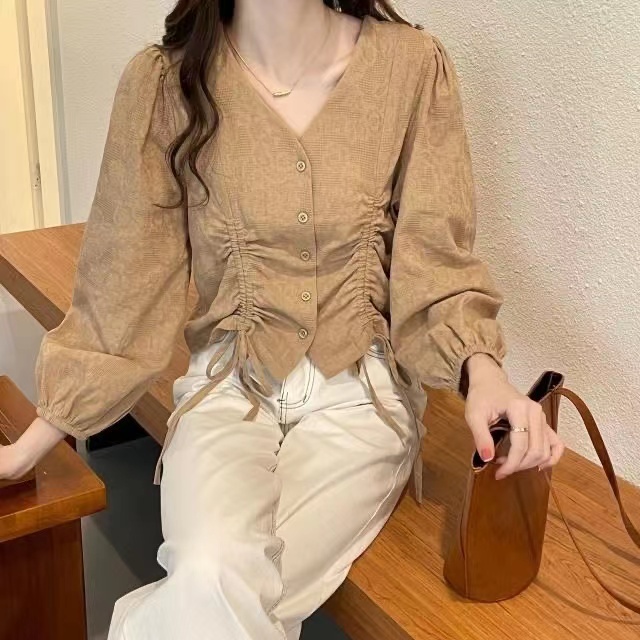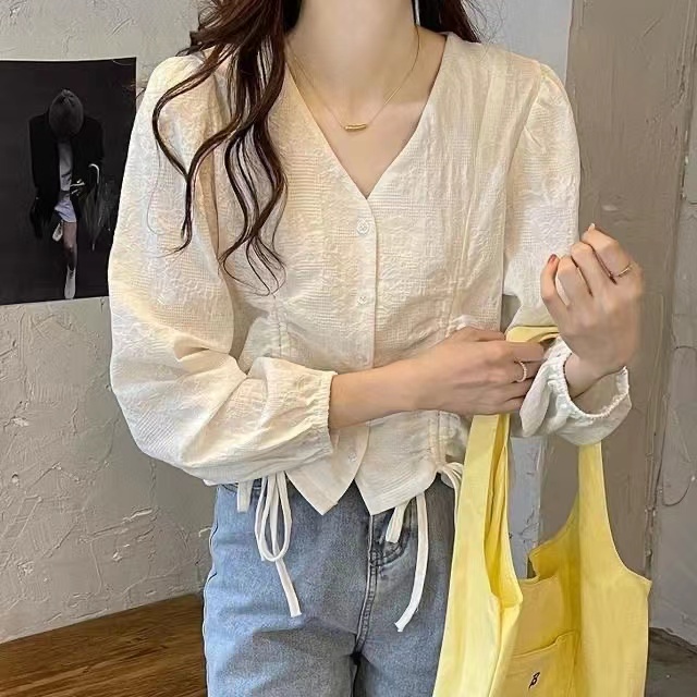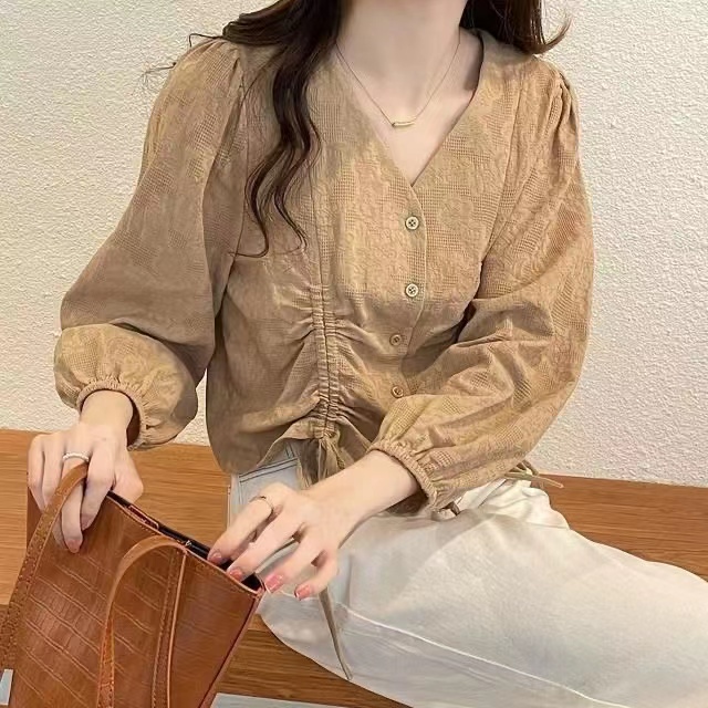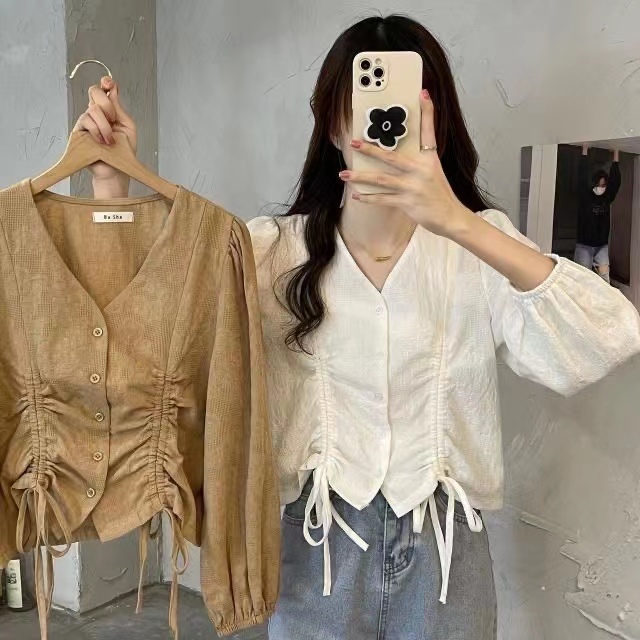 Korean Style Women Ladies Loose V Neck Drawstring Long Sleeve Shirt Blouse Baju Baju Wanita Lengan Panjang New Ready Stock