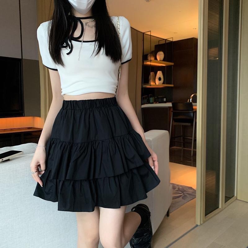 Korean Summer Pleated High Waist Elastic Band Mini Skirt Tiered Design Women Petite Short Skirt Korea musim panas lipit pinggang tinggi elastik band skirt reka bentuk berperingkat pendek mungil wanita
