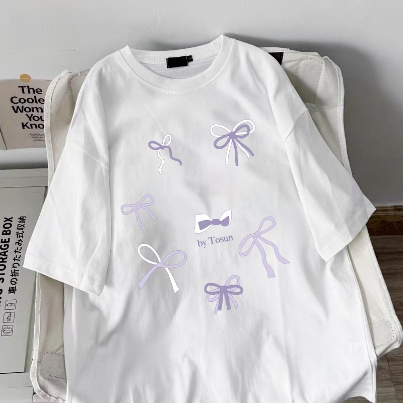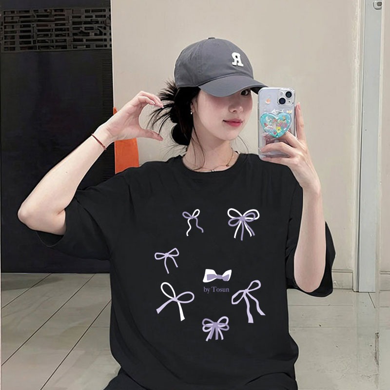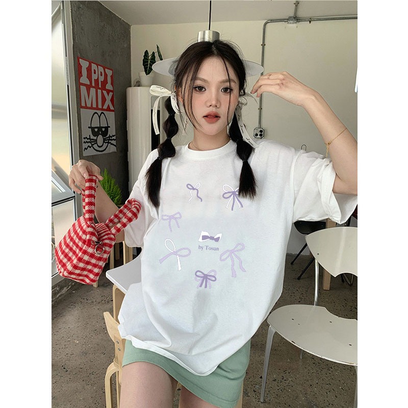 Korean women clothing | Oversized Crew Neck T-shirt 100% cotton | bow-knot print stylish casual tops y2k