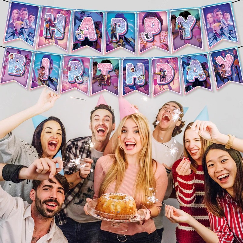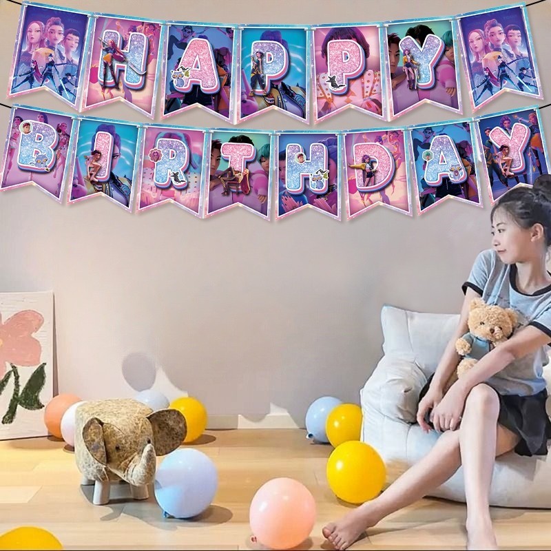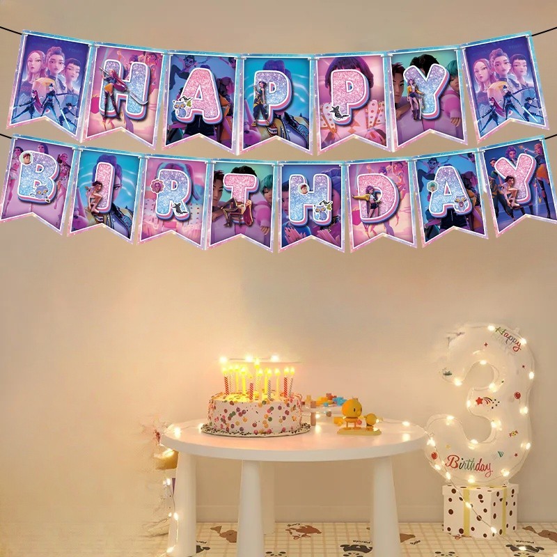 Kpop Demon Hunter Party Decoration Birthday Theme Party Banner Pull Flag Cake Topper Balloons Set