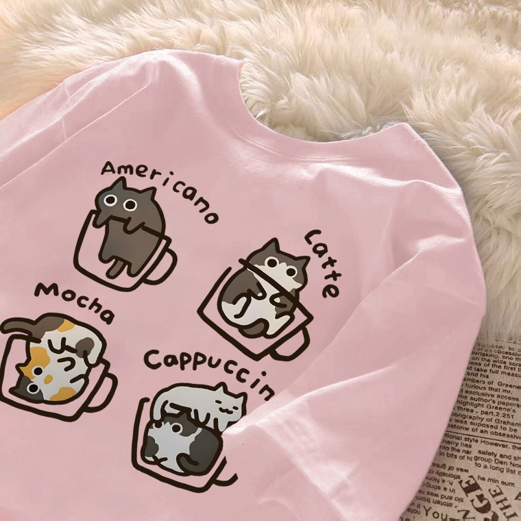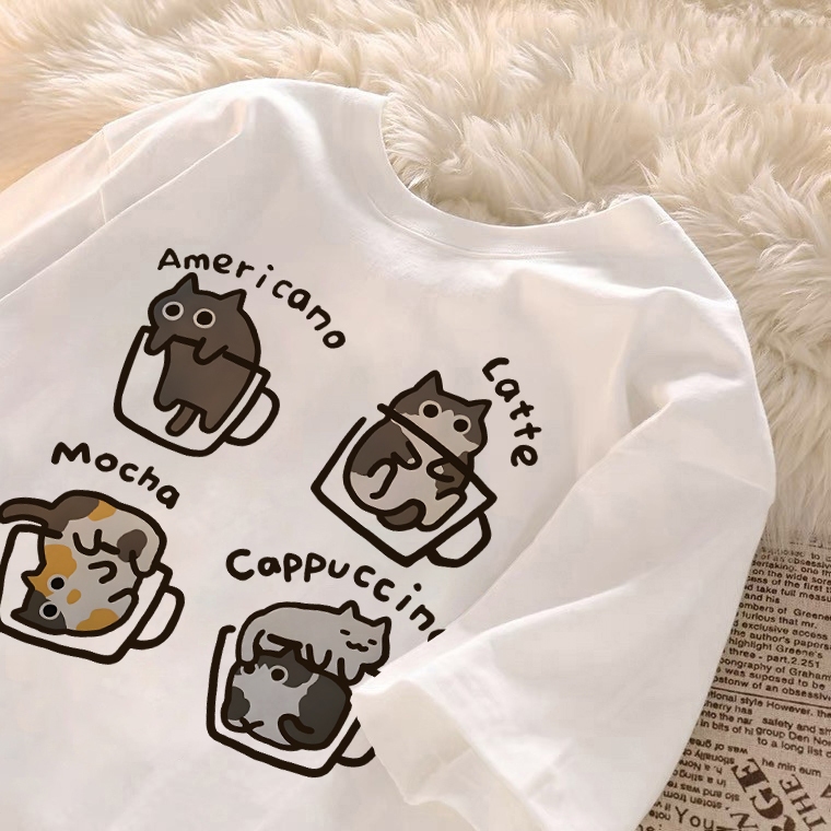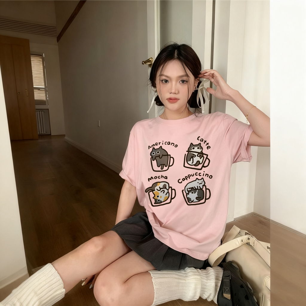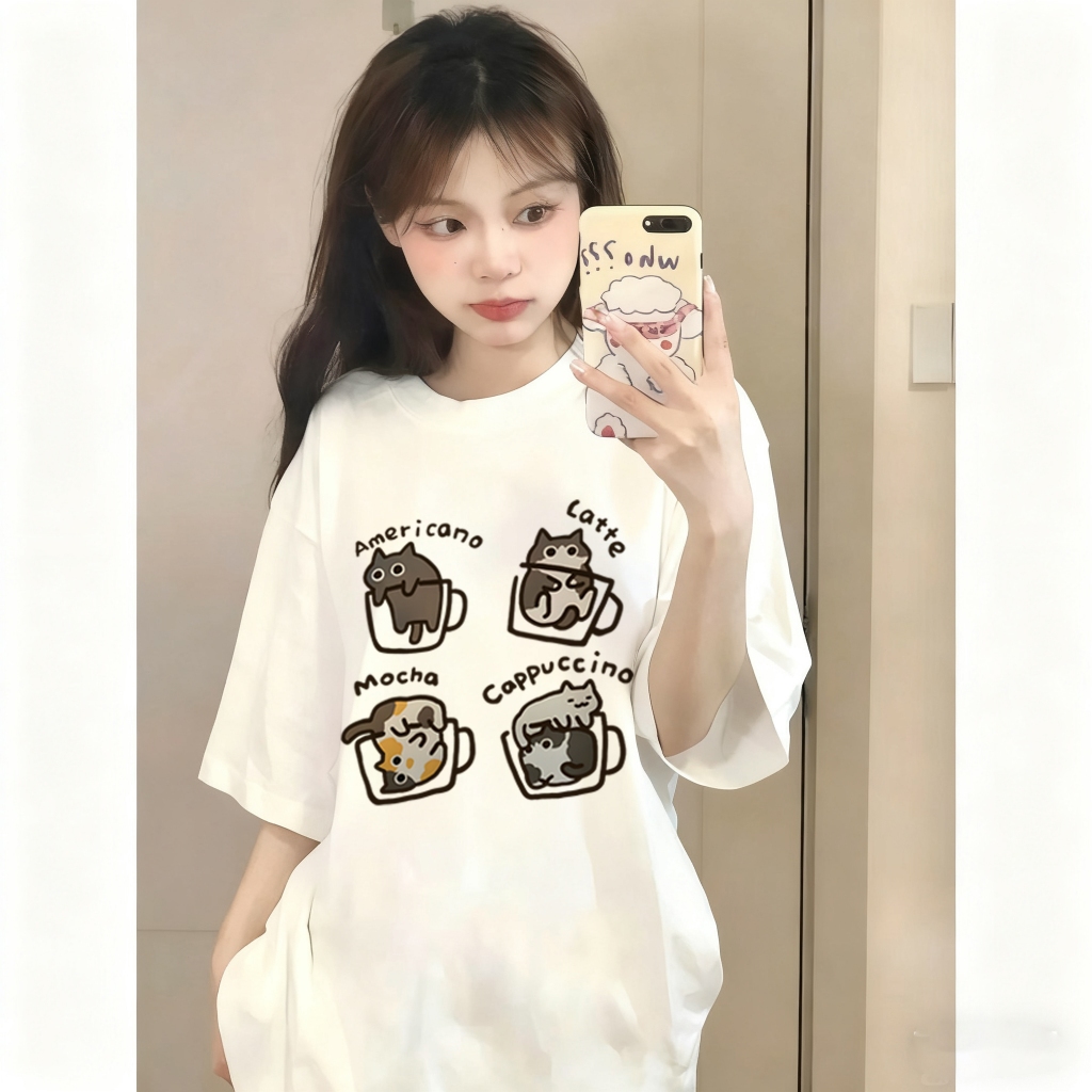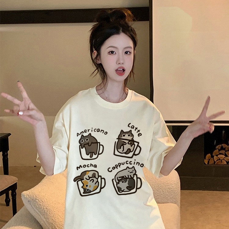 kumikumi Coffee and cats Korean Cute Coffee and cats Print oversized casual T-shirt for women